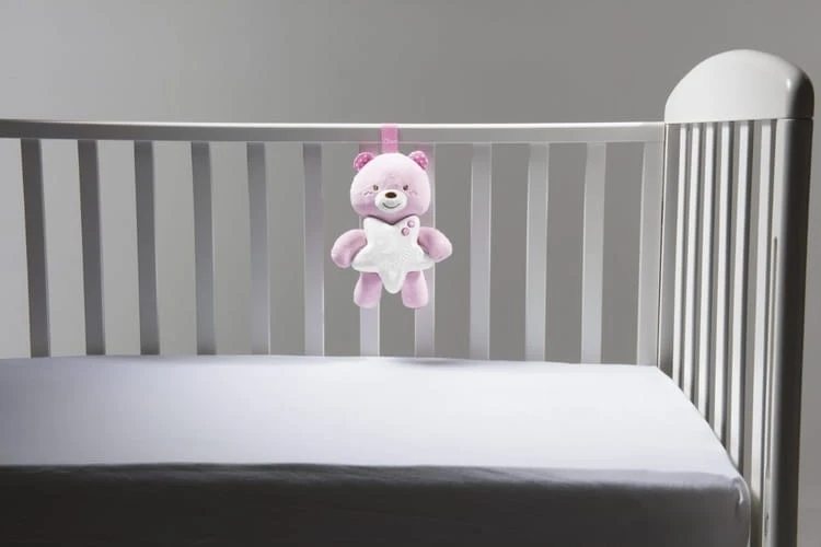 Das Spielzeug wird mit einem praktischen Klettband am Bettchen befestigt.