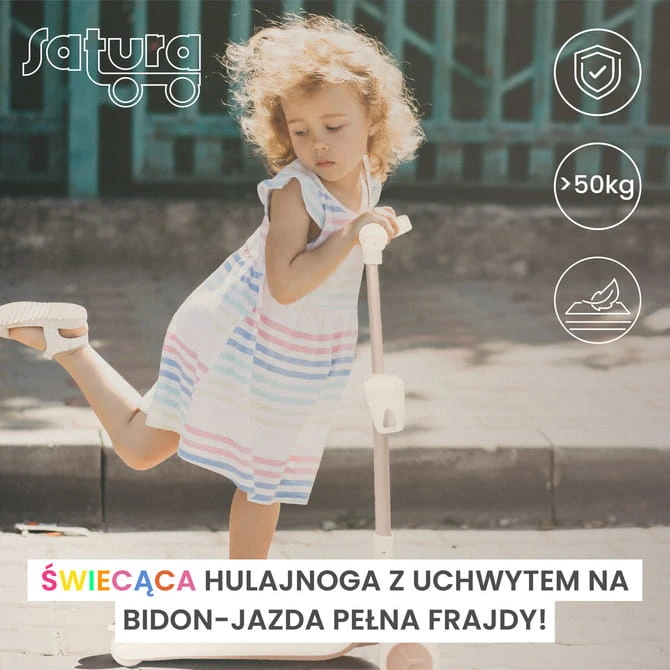 Dieser einzigartige Roller ist die ideale Wahl für Kinder ab 3 Jahren, die Aktivität und großen Spaß im Freien lieben. Die maximale Belastung beträgt 50 kg. Auffällige LED-Lichter an der Leiste und den Rädern schalten sich während der Fahrt automatisch ein und sorgen für eine farbenfrohe Beleuchtung. Dank innovativer Technologie funktionieren sie ohne Batterien, was garantiert, dass der Spaß nicht nur aufregend, sondern auch sicher ist!