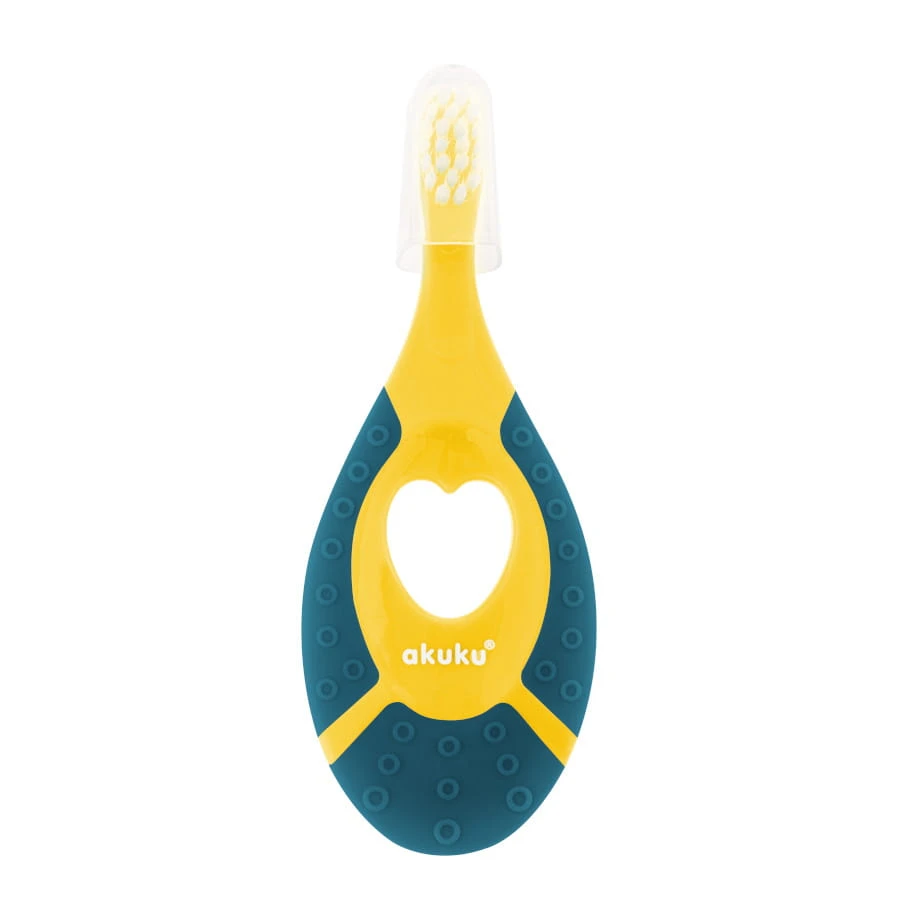 Die „akuku“ Zahnbürste ist für Kinder im Alter von 0–2 Jahren bestimmt. Durch regelmäßige Anwendung wird bereits bei den jüngsten Kindern die richtige Zahnputzgewohnheit gefördert, damit sie sich so früh wie möglich an die Mundhygiene gewöhnen. Der Griff der Zahnbürste wurde so gestaltet, dass ein zu tiefes Einführen in den Mund des Kindes verhindert wird. In diesem Alter sollte die Zahnbürste unter Aufsicht der Eltern verwendet werden. Die wichtigsten Merkmale unserer Zahnbürste: • Kurzer Bürstenkopf schützt vor Verletzungen und Reizungen • Weiche Borsten massieren sanft das Zahnfleisch • Speziell gestaltete Öffnung im Griff ist sowohl für Eltern als auch für das Kind bequem.