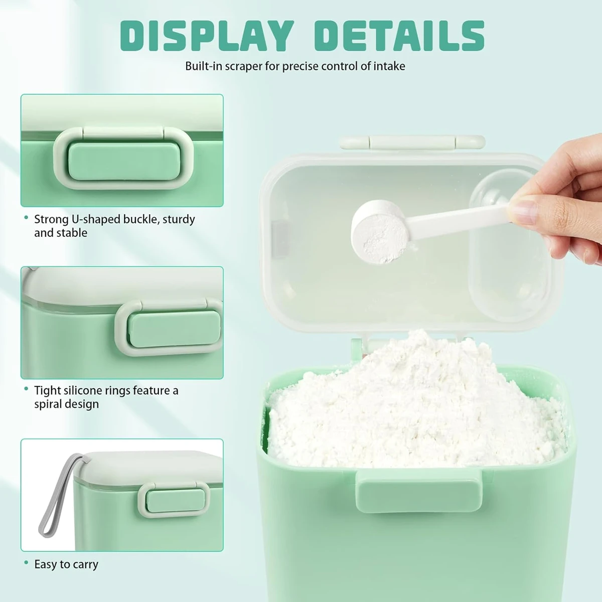 - Frischhaltung – Der Behälter für Babymilchpulver verfügt über ein Schnallendesign, und der innere Deckel ist mit einem Silikon-Dichtring ausgestattet, um die Versiegelung zu gewährleisten, das Milchpulver oder Lebensmittel zu schützen und die Haltbarkeit zu verlängern. Einfach zu reinigen und zu trocknen.