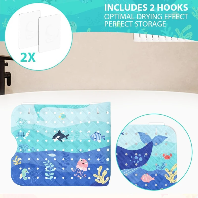 Sicheres Baden ohne Ausrutschen. Große Badematte mit über 200 Saugnäpfen haftet stabil in der Badewanne oder auf dem Duschboden. Das bunte, cartoonartige Meeres-Tier-Muster animiert Kinder zum Waschen und Spielen.