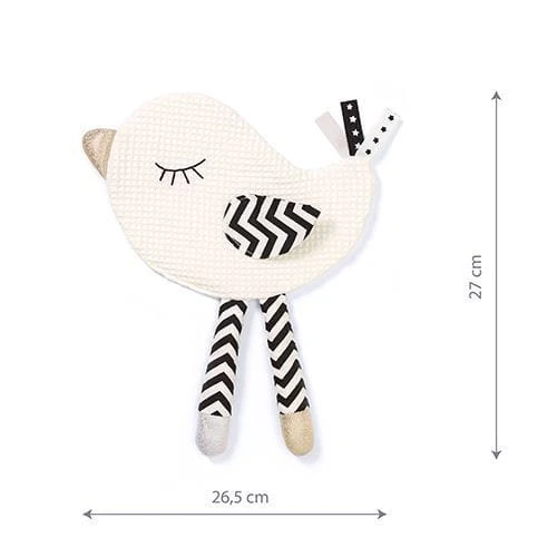 Der Knistervogel hat zwei Funktionen: sensorisches Spielzeug und Kuscheltier. Geeignet für Kinder ab den ersten Lebenstagen. Bietet verschiedene Reize. Stimuliert das Sehvermögen, das Gehör und den Tastsinn. Der Vogel ist aus Baumwolle gefertigt. Seine Füllung erzeugt ein angenehmes Knistern. Weckt Neugier und stärkt das Sicherheitsgefühl. Lange Beine, knisternder Flügel und glänzender Schnabel regen zum Greifen an. Verschiedene Texturen fördern die Entwicklung der Feinmotorik, und kontrastreiche Farben ziehen die Aufmerksamkeit auf sich. Der Knistervogel ist Teil der Blink&Smile Kollektion.