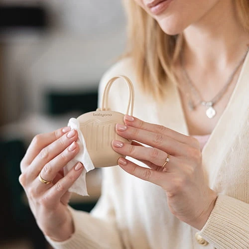 Wischen Sie das Etui einfach mit einem feuchten Tuch ab, spülen Sie es unter fließendem Wasser oder reinigen Sie es in der Spülmaschine. So bleibt es leicht sauber und bietet hygienische Aufbewahrung für den Schnuller.