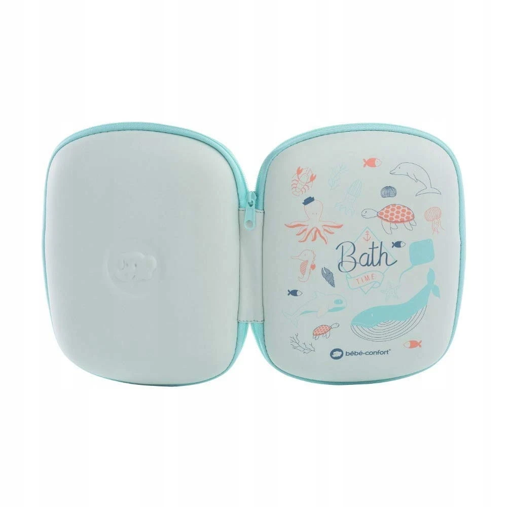 - Babykosmetiktasche mit Badethermometer in Schildkrötenform, Schere mit Halterung, ergonomischer Nagelknipser mit Halterung, Bürste mit weichen Borsten, Kamm mit abgerundeten Zähnen.