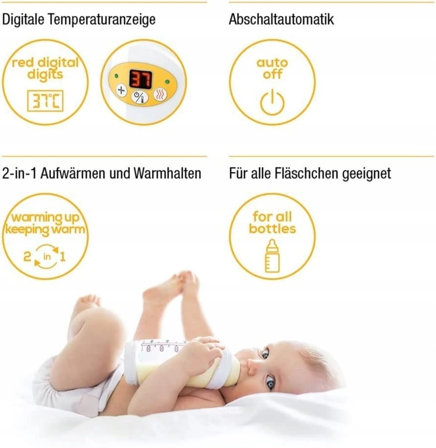 - Das Gerät eignet sich zum Erwärmen von Flaschen und Gläschen in Standardgrößen und ist zusätzlich mit einem speziellen Hebe-Einsatz ausgestattet, der das sichere Herausnehmen der Gläschen erleichtert.