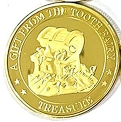 - Zweiseitige Münze mit Zahnfee-Motiven und Schatz.