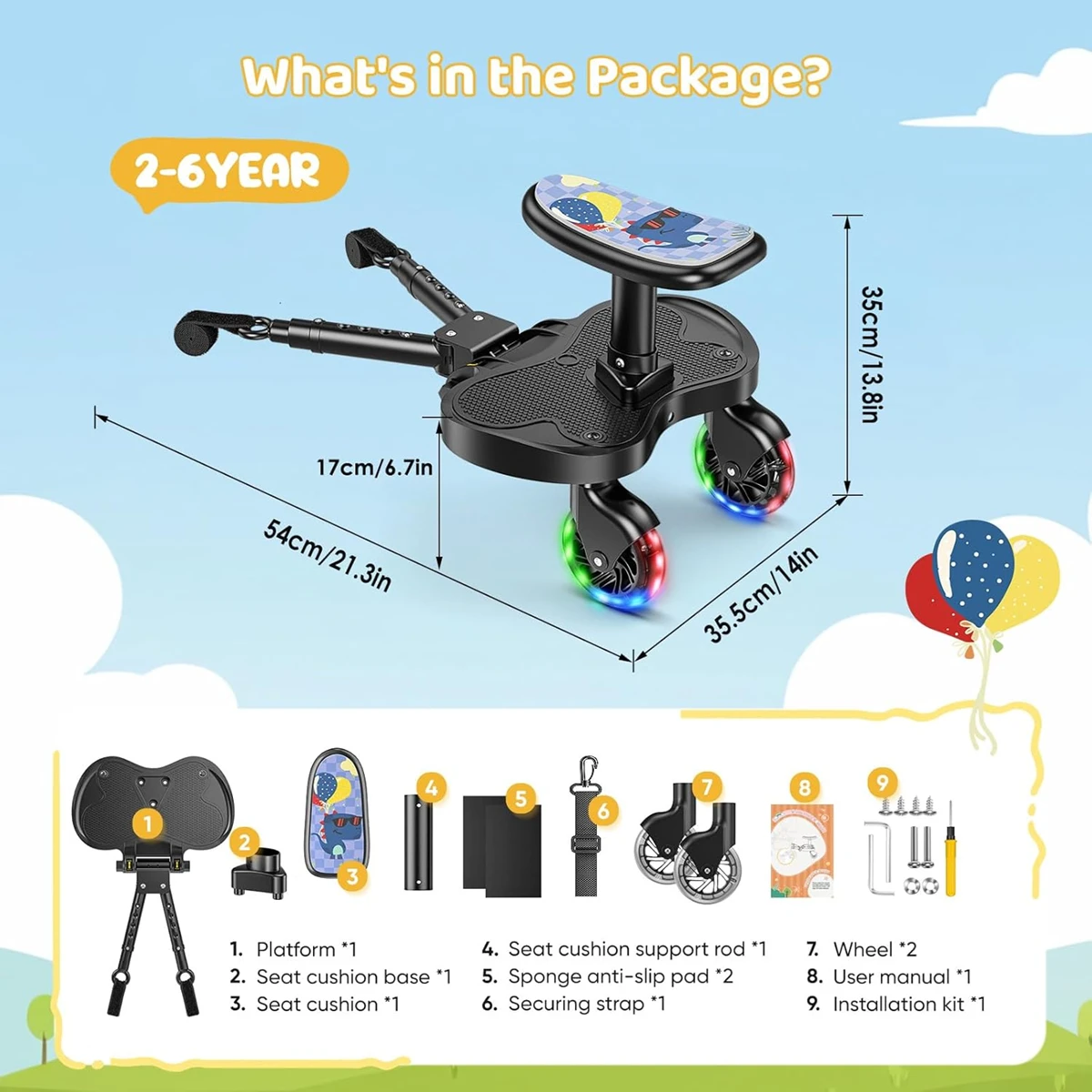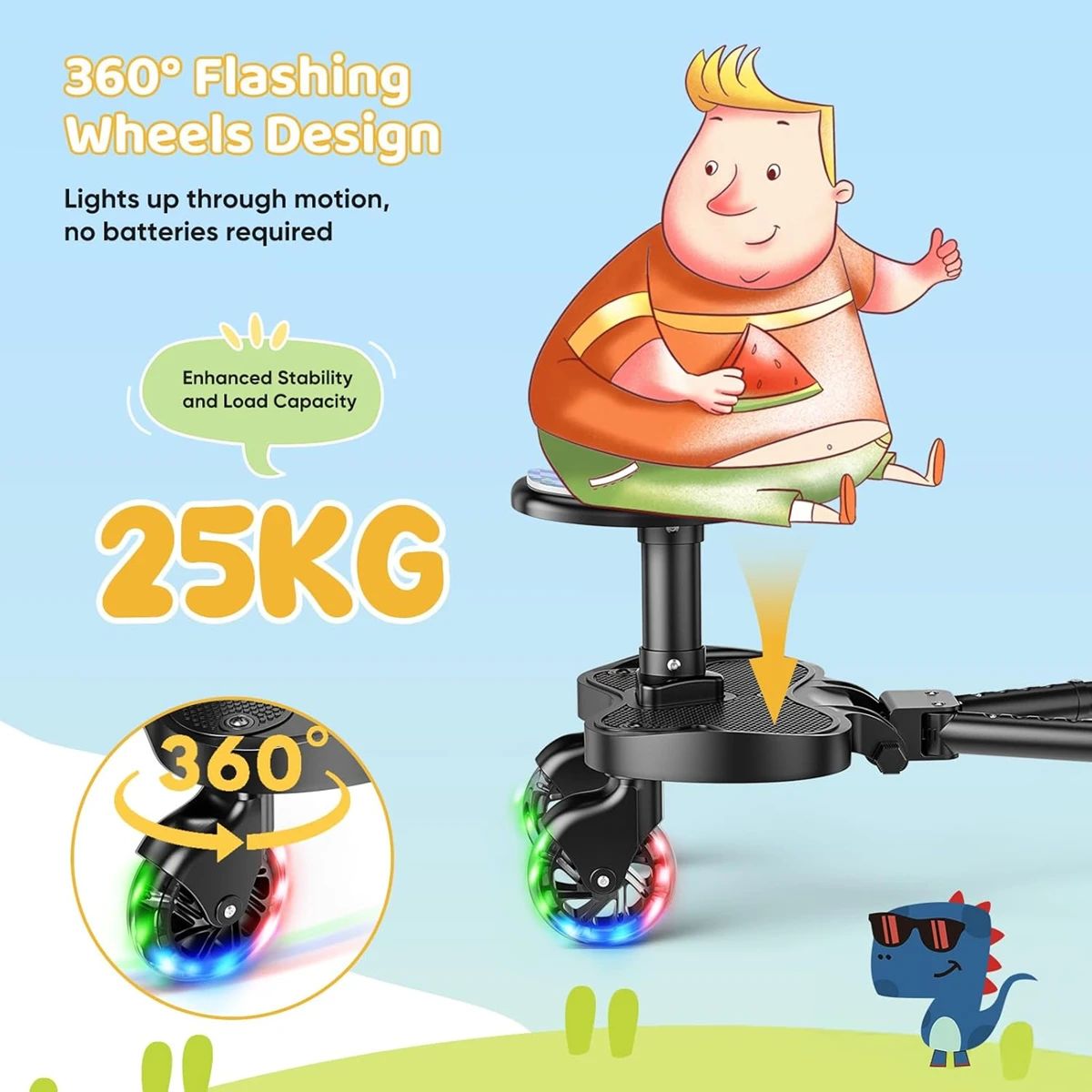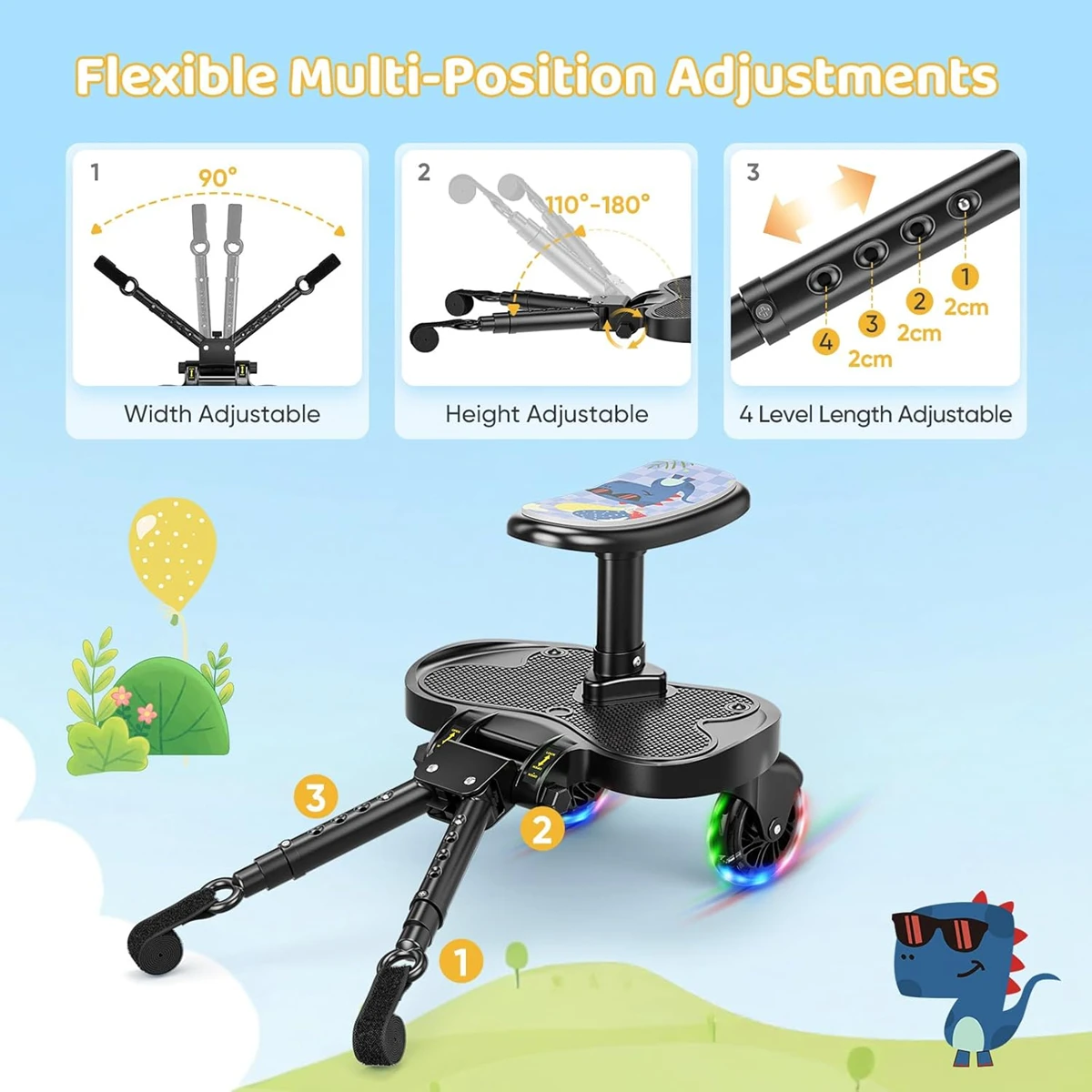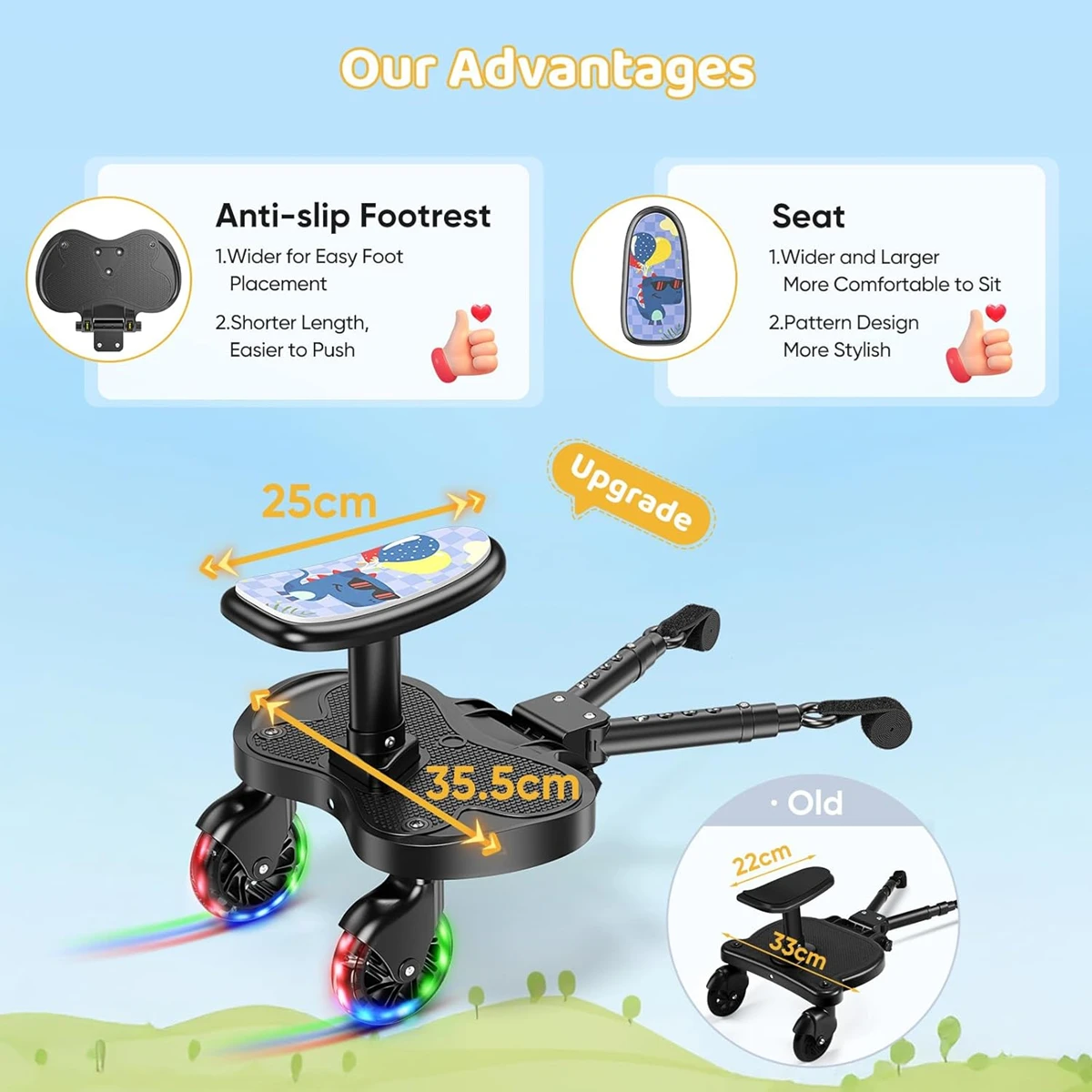 - Bequem und komfortabel: Das Kinderwagenbrett mit Sitz verfügt über einen größeren und weicheren Sitz sowie stoßdämpfende Schwenkräder, die den Kindern eine komfortable Fahrt bieten. Die erhöhte Breite bietet den Kindern ausreichend Platz für die Füße. Die verkürzte Länge vorne und hinten ermöglicht es den Eltern, den Kinderwagen bequem zu schieben, ohne die Füße zu behindern.