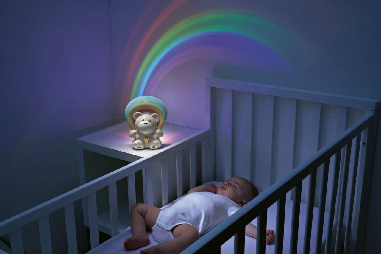 Die First Dreams Linie von Chicco bietet wunderschönes Spielzeug, das Kinder während des Schlafs oder der Ruhezeit mit Musik, Klängen und Lichteffekten begleitet und eine magische, entspannende Atmosphäre schafft. - Dank zahlreicher Funktionen und modularer Bauweise erfüllen sie die unterschiedlichen Bedürfnisse der Eltern… und natürlich der Kinder, - Sie ergänzen die Einrichtung und Atmosphäre des Hauses oder Kinderzimmers und machen es gemütlicher, - Sie sind ideale Produkte als Geschenk. DER TEDDYBÄR MIT REGENBOGEN-PROJEKTOR ist ein Spielzeug, das das Kinderzimmer sanft beleuchtet und vor dem Einschlafen eine angenehme, beruhigende Atmosphäre schafft – dank überraschender Projektionen eines magischen Regenbogens. Die Regenbogenprojektionen an Wand und Decke können personalisiert werden! 2 Projektions- und Musikmodi: - Projektion eines statischen Regenbogens, der alle Farben gleichzeitig mit klassischer Musik anzeigt; - Projektion eines bewegten Regenbogens, bei dem die Farben nacheinander mit New Age Melodien erscheinen. Der um 360° drehbare Spiegel ermöglicht es, die Breite und Richtung der Regenbogenprojektion an Wand oder Decke je nach Raum und Platzierung des Spielzeugs individuell anzupassen! Der Projektor verfügt über einen Timer – Eltern können einen 15- oder 30-minütigen Projektions- und Musikzyklus wählen. Es sind 3 Farbvarianten erhältlich: rosa, blau und neutral. Der Projektor hat die Maße: 13x8,5x19 cm. Das Panel wird mit 3 „AA“-Alkalibatterien mit 1,5 V betrieben. Batterien sind nicht im Lieferumfang enthalten.