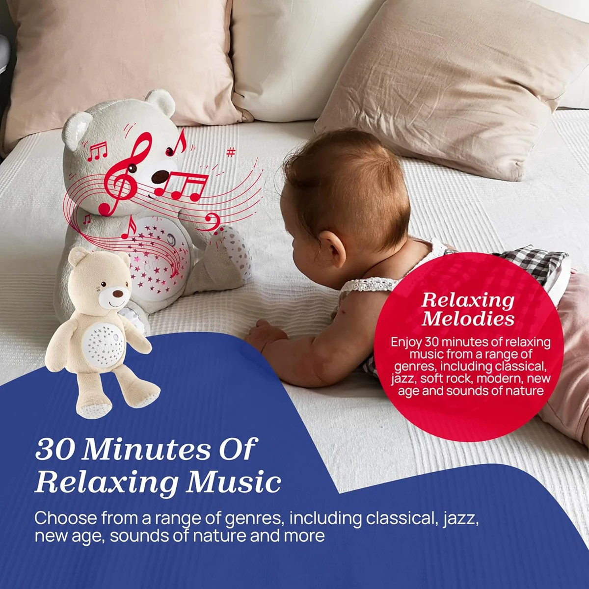 - MELODIEN: Neben der Nachtlichtfunktion für das Baby bietet der Plüschbär 30 Minuten klassische, Jazz-, Soft-Rock-, New-Age- und Naturklänge mit einer Taste zur Auswahl der Lieblingsmelodie.