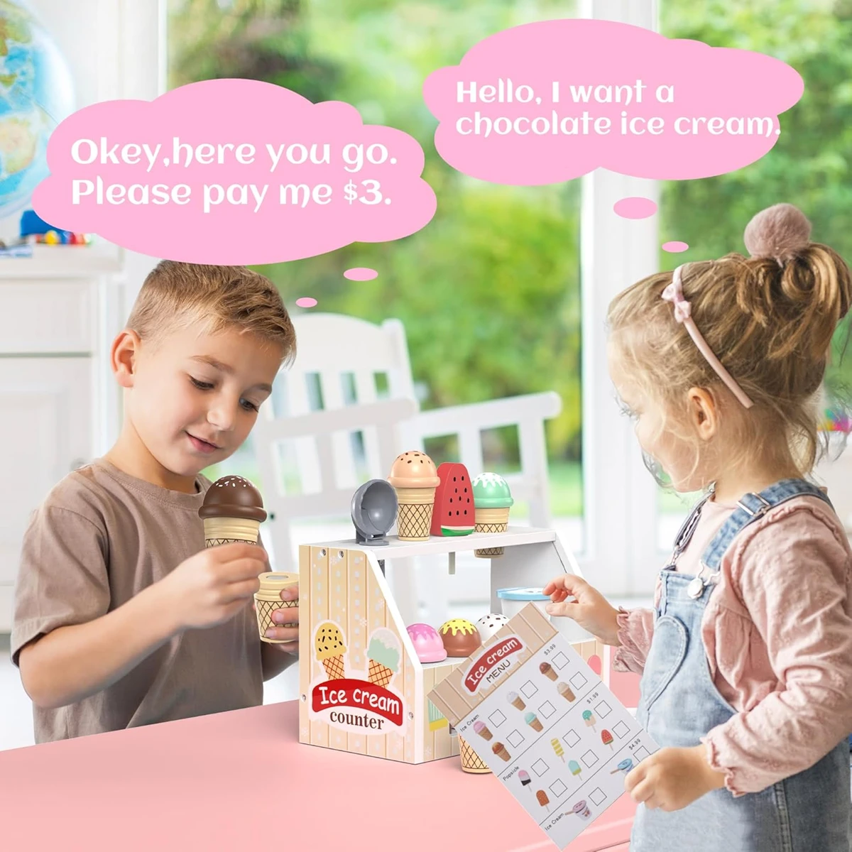 - Rollenspiel Eisdiele für Kinder – die Holz-Eisdiele für Kinder ist mit 49 Teilen ausgestattet. Dieses Eiscreme-Spielzeug für Kinder ab 3 Jahren bildet sowohl den Herstellungs- als auch den Verkaufsprozess nach. Es ermöglicht Kindern, Bedienfunktionen zu nutzen, fördert die Interaktion mit anderen und unterstützt die Kreativität
