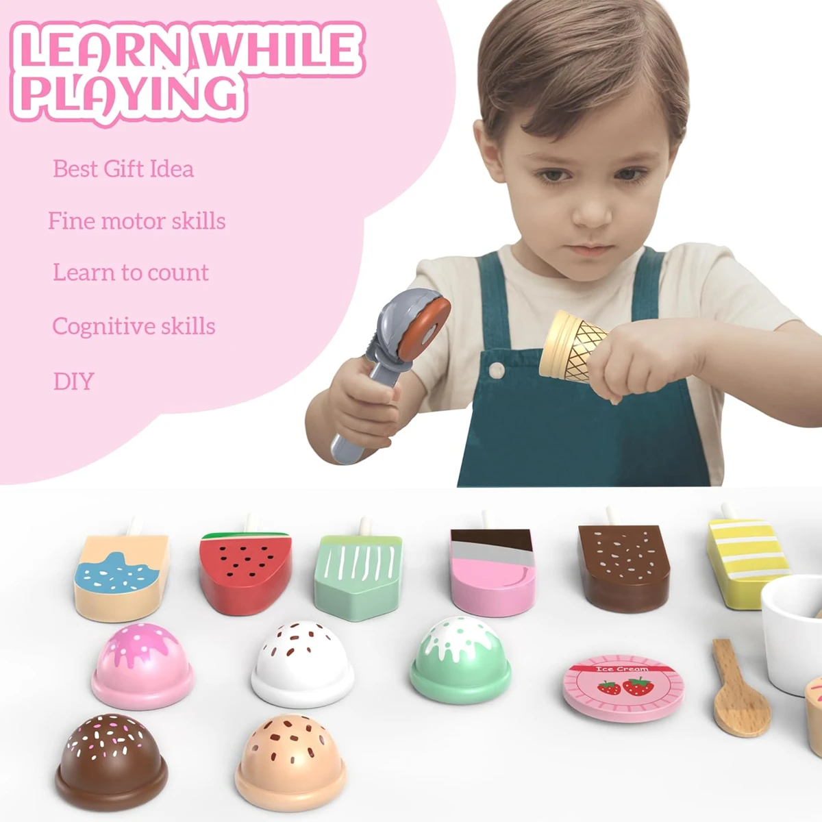 - Montessori-Spielzeug ab 3 Jahren als Weihnachtsgeschenk für Kinder – unser Holz-Eiscreme-Spielzeug enthält eine Holzeistheke und farbenfrohes Zubehör zur Eisherstellung. Unser Holz-Zubehör für den Einkaufsladen hilft Kindern nicht nur, grundlegende mathematische Konzepte zu erkennen, sondern auch Farben zu lernen. Spielzeug für Kinder ist ein tolles Geschenk für Kinder ab 3 Jahren. Es fördert die Feinmotorik, Geschicklichkeit, Hand-Auge-Koordination, Farberkennung und das Greifen und hilft ihnen, selbstständiger zu werden