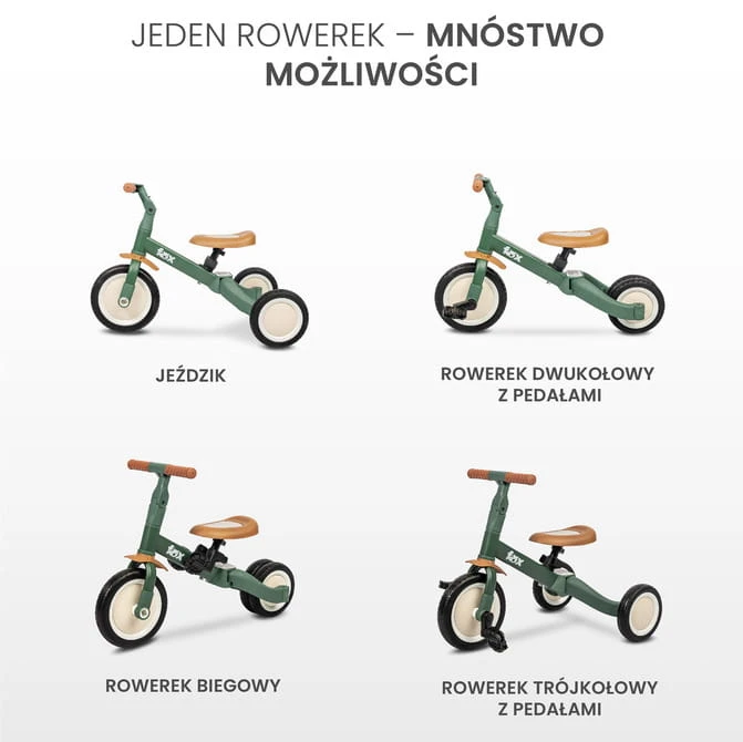 Dank der durchdachten Konstruktion erfüllt das Fahrrad gleich vier Funktionen – als Rutscher, Laufrad, Dreirad mit Pedalen und Zweirad mit Pedalen, sodass es sich an die Bedürfnisse und Fähigkeiten des Kindes in jeder Entwicklungsphase anpasst. Das Fahrrad ist für Kinder im Alter von 18 Monaten bis ca. 5 Jahren geeignet und kann sicher von Kindern mit einem Gewicht von bis zu 25 kg.