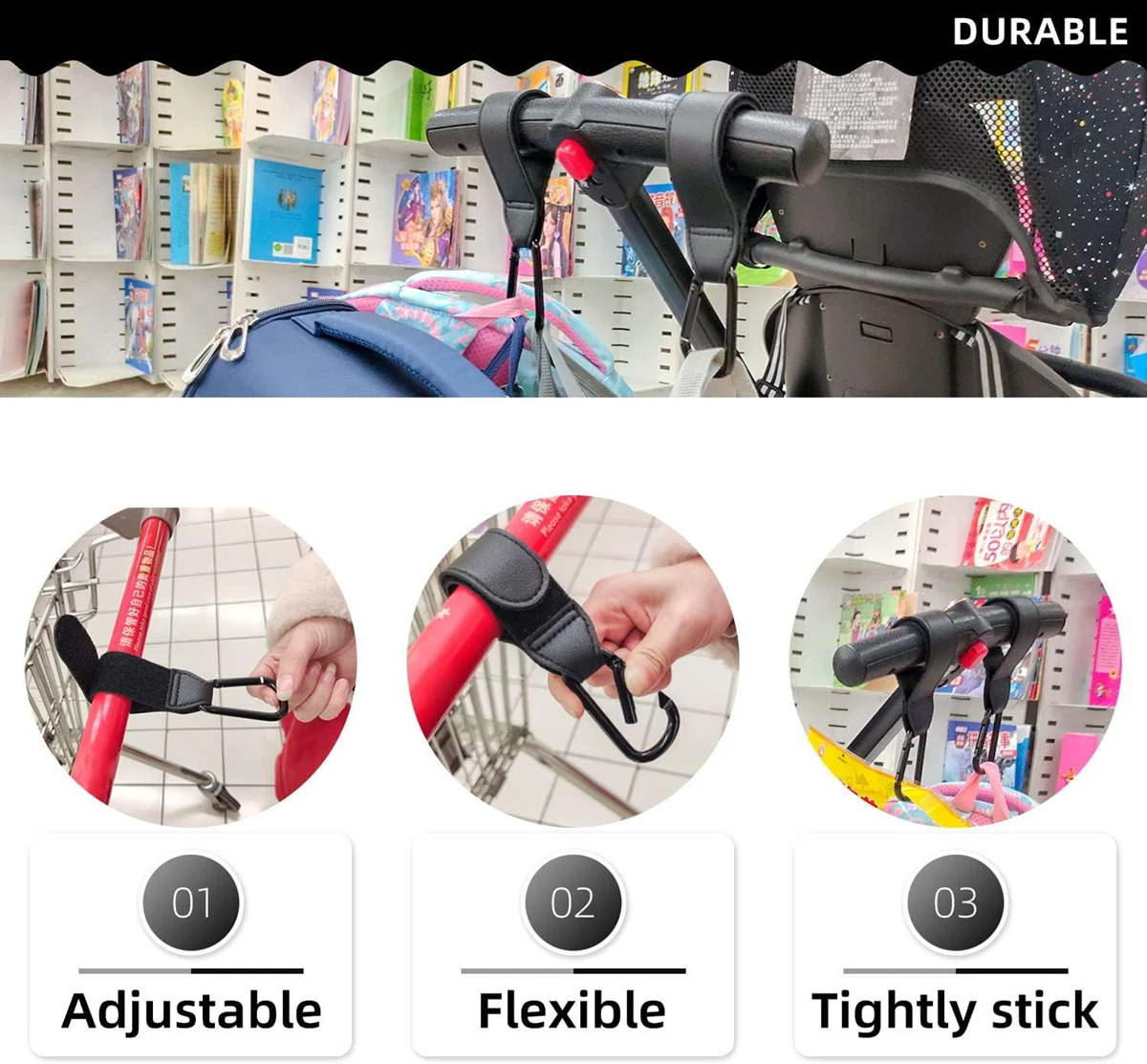 - 【Hohe Qualität】: Hergestellt aus starkem Aluminium-Kinderwagenhaken und strapazierfähigem Kunstlederband. Robuste, rutschfeste, stark haftende Konstruktion, flexible Öffnungen, alle Einkaufstaschen können einfach und sicher aufgehängt werden. Der Klettverschluss ist sehr stark. Einfache Montage. Einfach Sachen aufhängen.