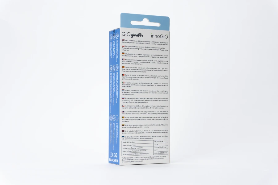 Sonic Zahnbürste für Kinder GIOgiraffe ist in zwei Farbvarianten erhältlich: Rosa und Blau. Die Sonic Zahnbürste GIOgiraffe schützt die empfindlichen Kinderzähne vor schädlicher Karies und sorgt für gesundes Zahnfleisch. Sie ist mit einem Zwei-Minuten-Timer ausgestattet, der alle 30 Sekunden signalisiert, dass zum nächsten Viertel des Zahnbogens gewechselt werden soll. Im Set ist ein zusätzlicher austauschbarer Bürstenkopf enthalten, damit das strahlend weiße Lächeln noch länger erhalten bleibt. Die einzigartige elektrische Sonic Zahnbürste für Kinder GIOgiraffe unterstützt die Gewohnheit der richtigen Zahnpflege schon ab den ersten Lebensjahren. Die einzigartige und originelle dreidimensionale Silikonoberfläche ist angenehm zu berühren und sorgt für einen bequemen Griff, während der leuchtende Bürstenkopf in 7 Farben Kinder dazu ermutigt, zur Zahnbürste zu greifen. Zähneputzen, das für umfassende Mundhygiene sorgt. Die weichen Borsten des Bürstenkopfes aus DuPont-Material mit abgerundeten Enden sind widerstandsfähig gegen Beschädigungen und Abnutzung und sorgen für eine gründliche und sanfte Reinigung der Kinderzähne. Die Größe des Bürstenkopfes ist für Kinder im Alter von 2 bis 12 Jahren angepasst. GIOgiraffe verfügt über 4 voreingestellte Leistungsmodi, die das richtige Zähneputzen in jedem Alter unterstützen: Modus eins – 7 Farben, Modus zwei – sanftes Bürsten, Standardbürsten und starkes Bürsten. Einzigartiges Design der Zahnbürste. Farbige Beleuchtung und fröhliches Tierdesign machen das Zähneputzen für Kinder zum Vergnügen und fördern gesunde Gewohnheiten. Der leichte und ergonomische Griff erleichtert Kindern den Einstieg in die selbstständige Mundhygiene, und die Silikonoberfläche verhindert das Abrutschen der Zahnbürste.