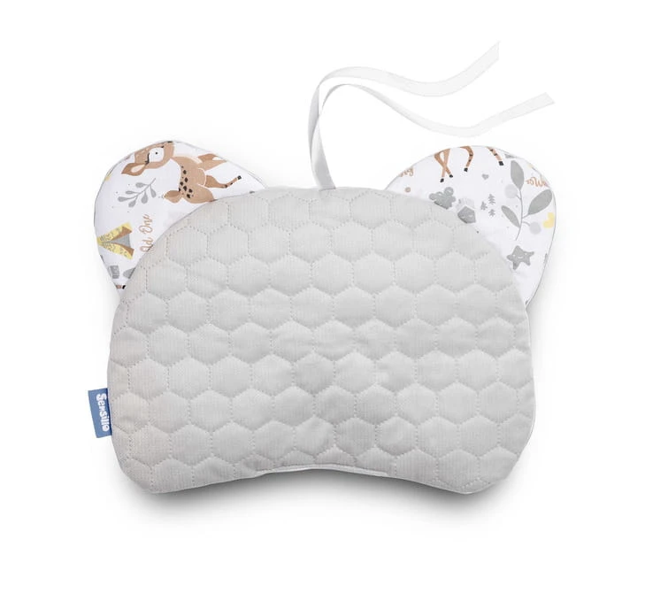 Das MIŚ Kinderwagenkissen ist bereits ab den ersten Lebensmonaten als weiche Unterlage für den Kopf zu Hause oder unterwegs ideal geeignet. Es passt sowohl ins Babybett als auch in den Kinderwagen (es kann an die Einlage aus derselben Kollektion gebunden werden). Das Kissen ist beidseitig verwendbar – eine Seite besteht aus 100% Baumwolle, die andere aus weichem Velvet. Das Kissen hat angenähte Bänder, mit denen es an der Kinderwageneinlage befestigt werden kann. Bei Bedarf können diese leicht abgeschnitten werden.