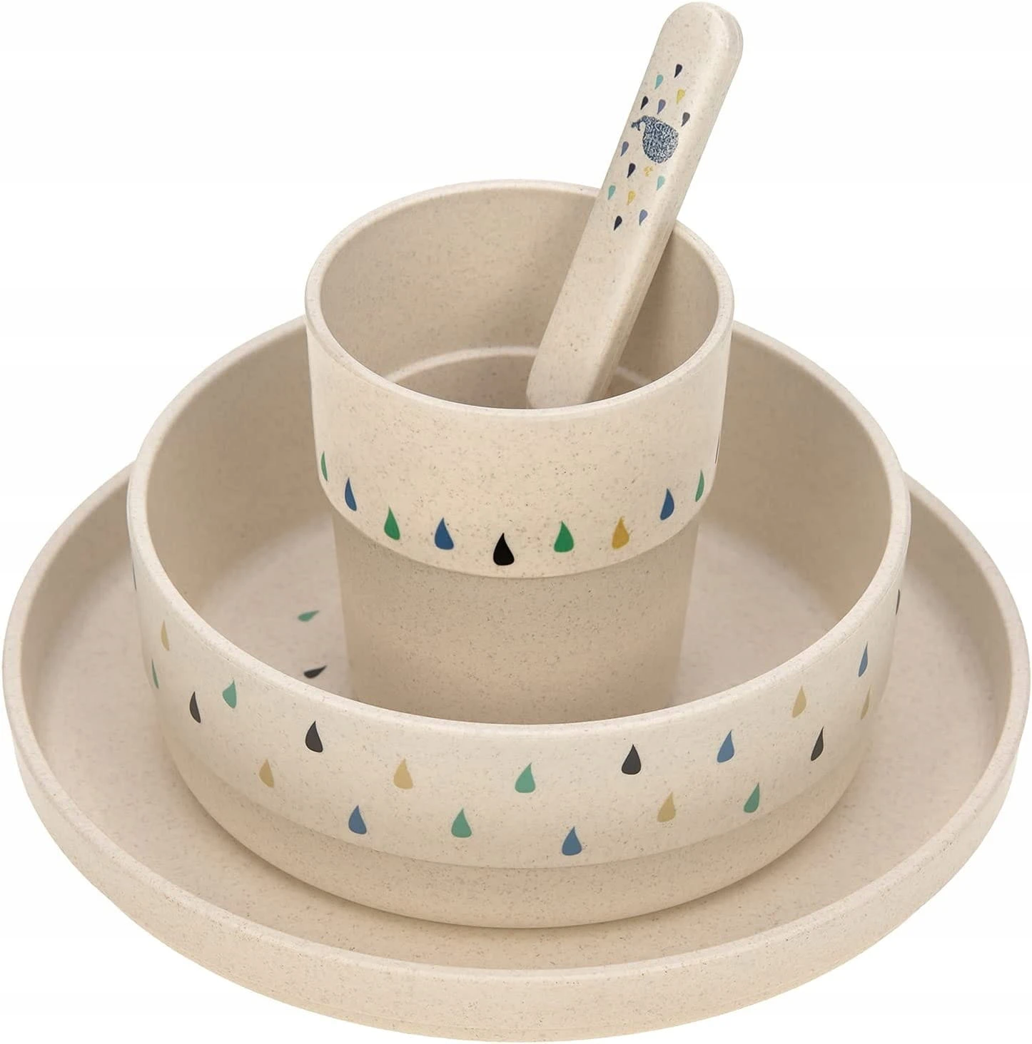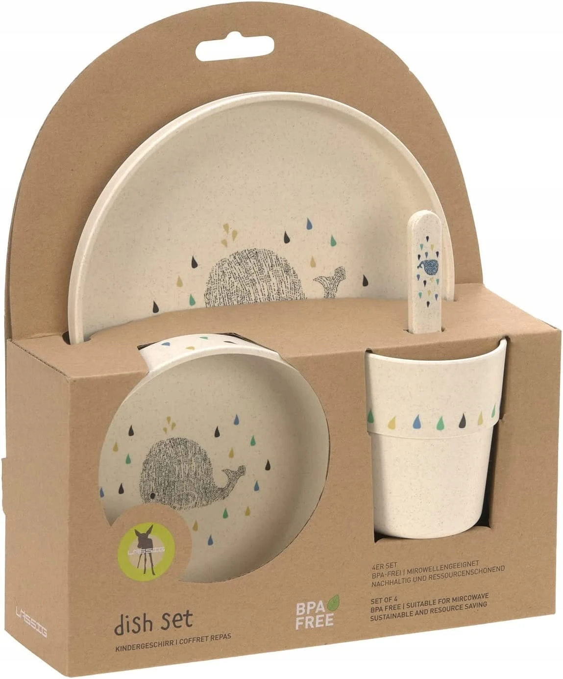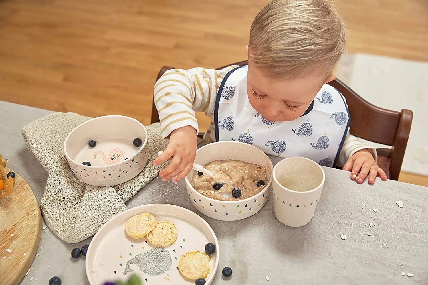 - Das Kindergeschirr besteht aus einer Mischung aus Polypropylen und Zellulose und ist dadurch nachhaltiger und ressourcenschonender als herkömmliches Polypropylen
