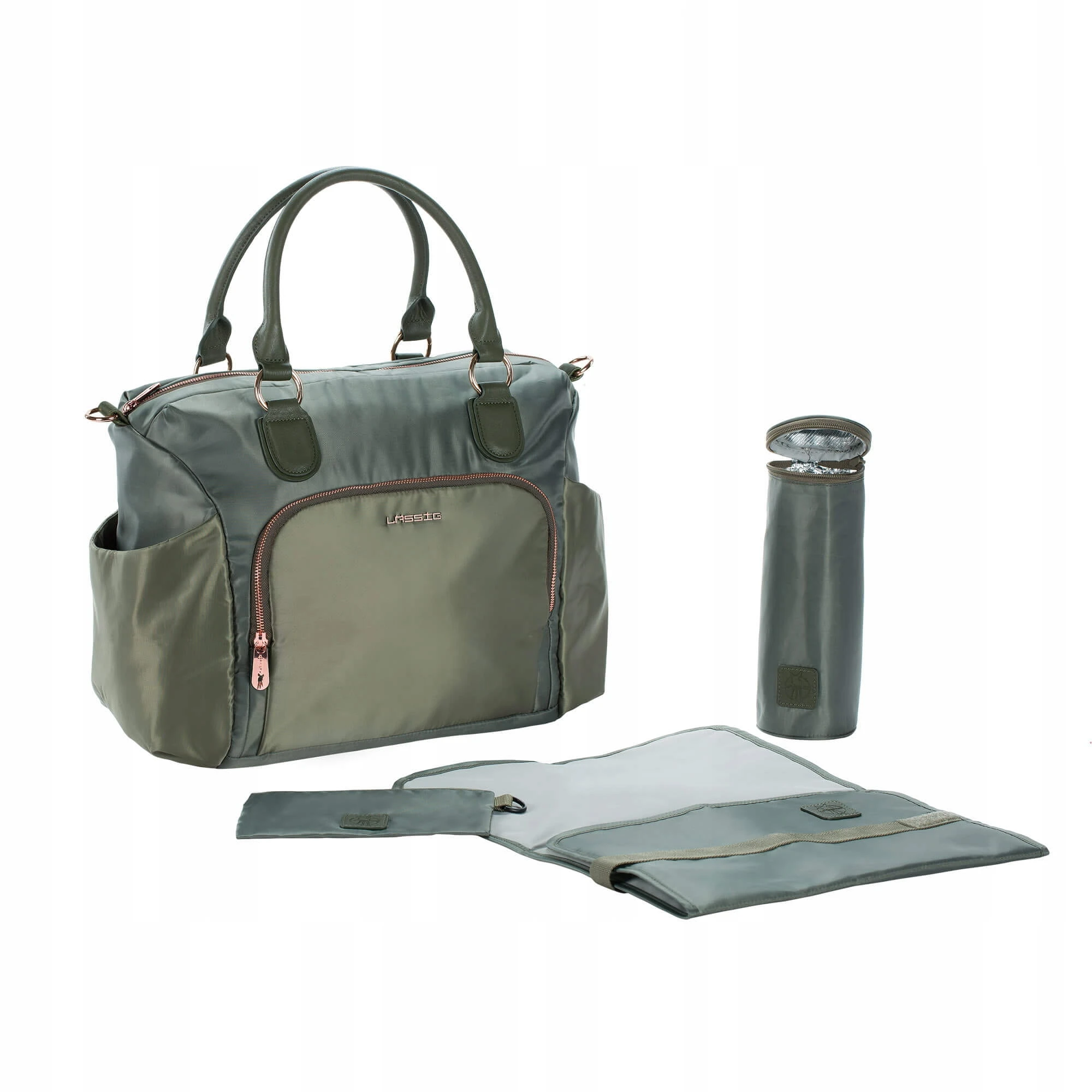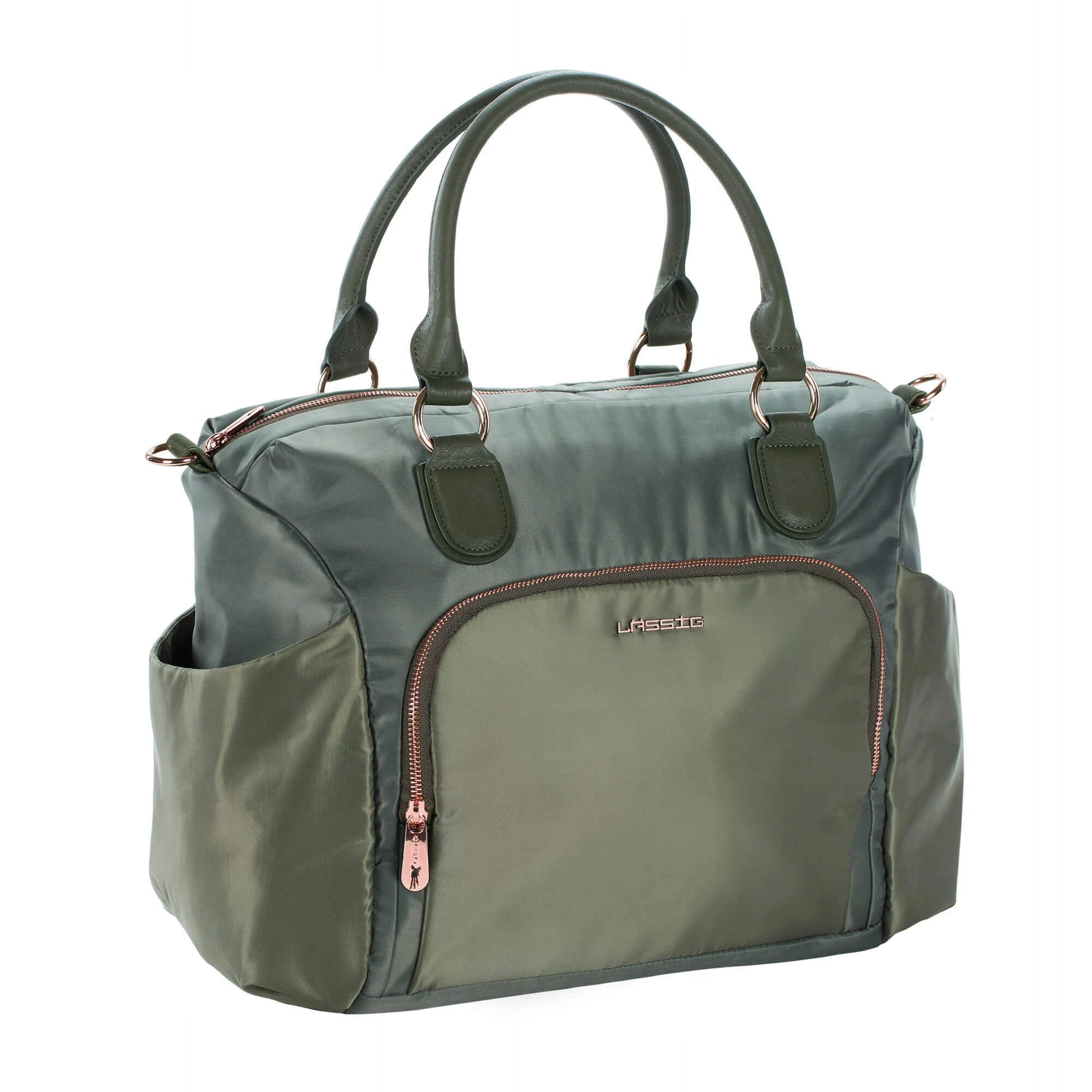 Die Wickeltasche mit geräumigem Hauptfach und integriertem Handyfach enthält praktisches Zubehör wie eine wasserdichte Wickelunterlage, einen isolierten Flaschenhalter, ein herausnehmbares Fach für Babybrei, ein wasserdichtes Nassfach sowie einen zusätzlichen, verstellbaren Schultergurt mit Lassig-Schriftzug. Die Kinderwagentasche kann schnell und einfach am Kinderwagen befestigt oder als stylische Handtasche über der Schulter getragen werden.