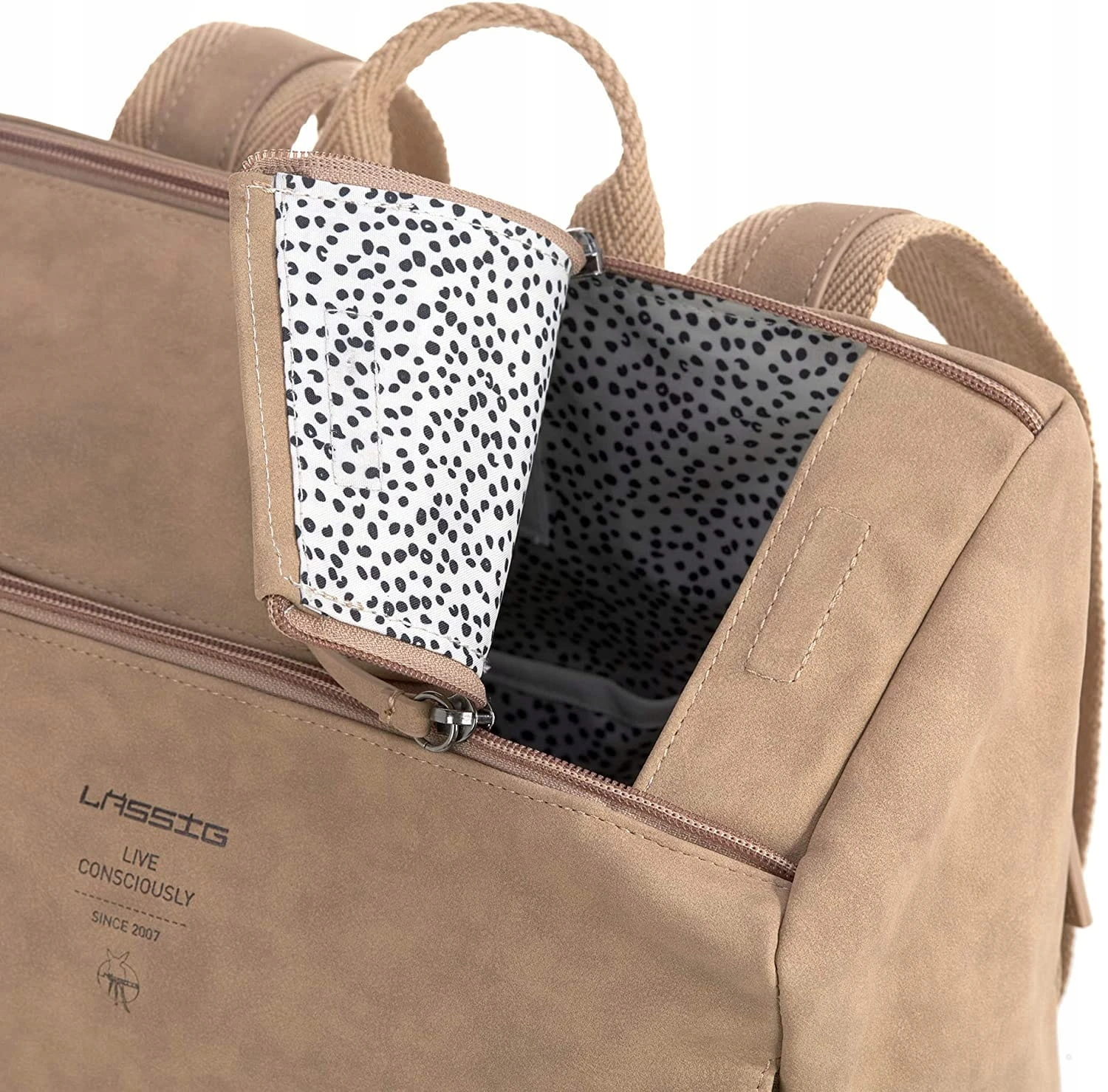 - Veganer Wickelrucksack LASSIG im Velours-Look ist ein absolutes Must-have für Eltern, die Einfachheit und Diskretion bevorzugen. Das moderne, lineare Design wird durch ein praktisches Reißverschlusssystem ergänzt. Der stabile Rucksack kann sicher abgestellt werden, und der doppelte Reißverschluss sorgt für eine klare und große Öffnung. Wenn Sie den Rucksack schnell schließen müssen, können Sie ihn auch einfach mit dem Magnetverschluss schließen. Das gut durchdachte Innenleben und Zubehör ergänzen diesen Wickelrucksack.