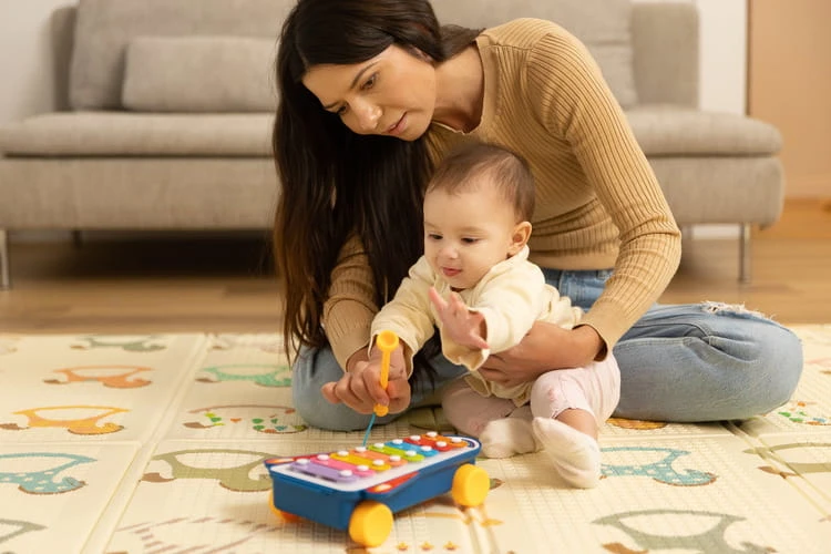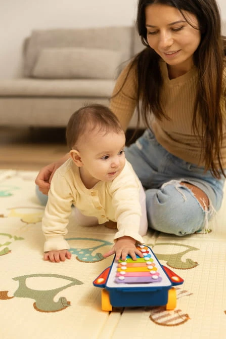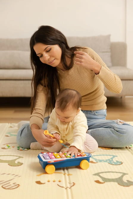 Regenbogen-Xylophon von TOYZ ist ein farbenfrohes Lernspielzeug, das Ihr Kind in die Welt der Musik einführt. Das Xylophon ist an der Unterseite mit Rädern ausgestattet, sodass das Spielzeug auch als Rennauto verwendet werden kann. Der Schlägel ist an einer Schnur befestigt, damit er nicht verloren geht. Das Spielzeug ist für Kinder ab 18 Monaten geeignet. Das Xylophon ist in 2 Farbvarianten erhältlich, die zufällig versendet werden.