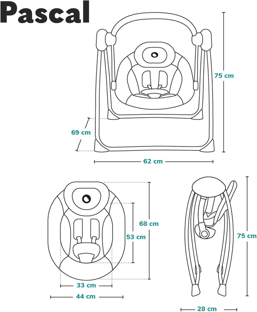 Mit nur einer Bewegung verwandelt sich Pascal von einer Wippe in eine bequeme Liege. 5-Punkt-Gurte sorgen für die Sicherheit des Babys. Für noch mehr Komfort befindet sich am Kopfteil ein zusätzliches Kissen, das den Kopf stabilisiert. Hochwertiger, hautfreundlicher Bezug ist maschinenwaschbar.
