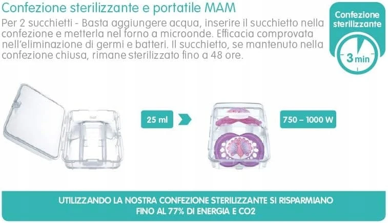 Schnelle und einfache Sterilisation Der MAM Perfect Schnuller wird in einer speziellen Aufbewahrungs- und Sterilisationsbox verkauft. Einfach Wasser einfüllen, Schnuller hineinlegen und 3 Minuten in die Mikrowelle stellen. 100% Hygiene!