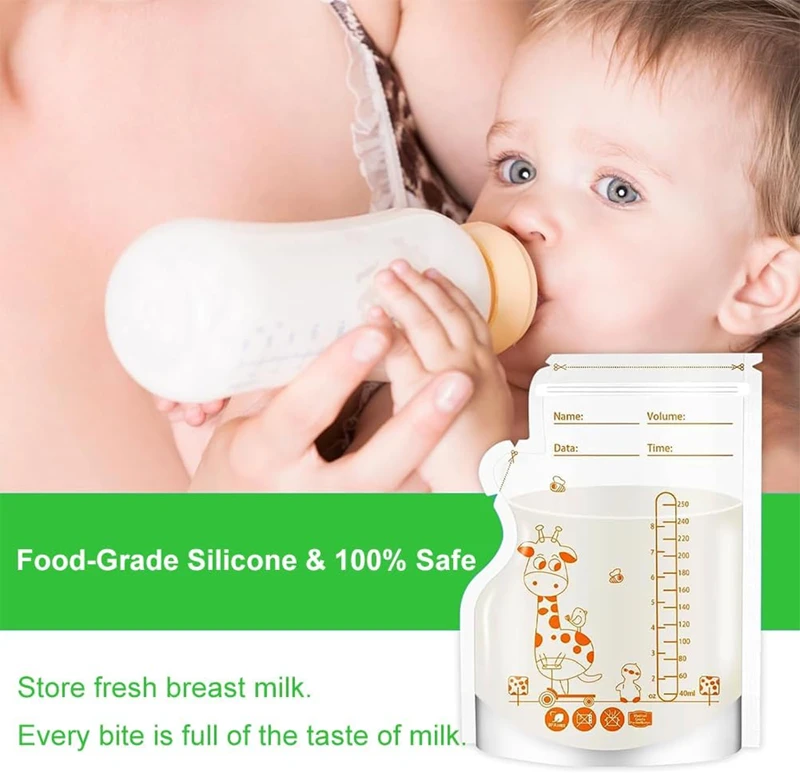 - Große Kapazität – Das Fassungsvermögen des Beutels beträgt 250 ml. Direkt auf dem Beutel befindet sich ein Feld, in das Sie den Namen und das Datum der Muttermilch eintragen können, um die Identifizierung und Lagerung zu erleichtern (Tipp: Für eine genaue Skala drücken Sie vor dem Verschließen die restliche Luft aus dem Muttermilchbeutel. "Platzsparend").