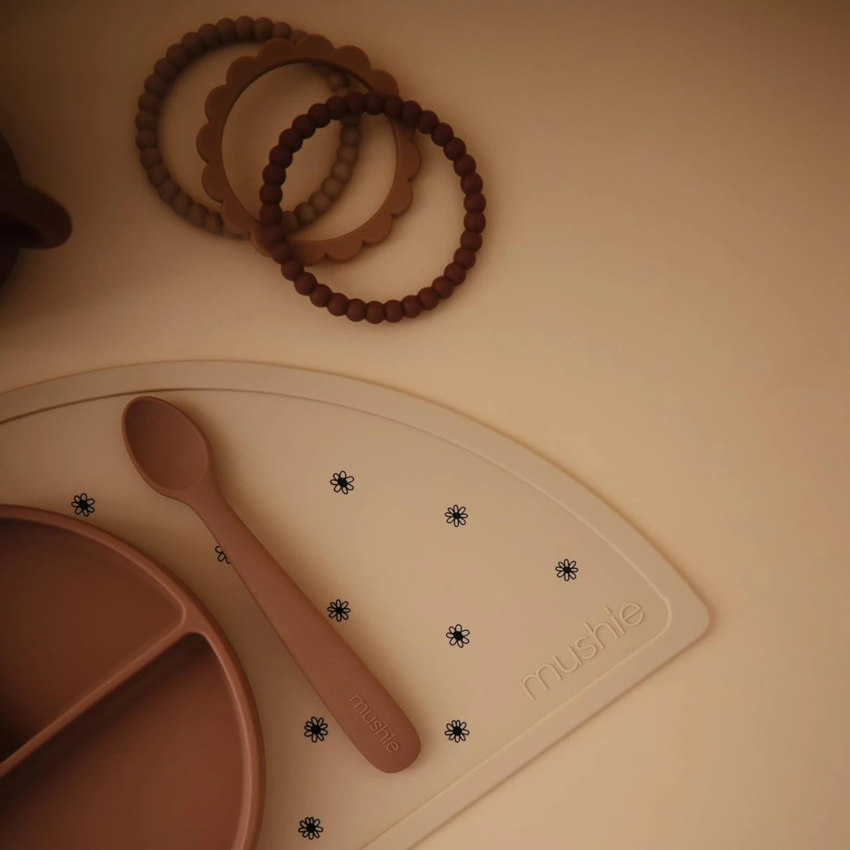 - Verwenden Sie das Silikon-Tischset von Mushie für eine einfache Reinigung!