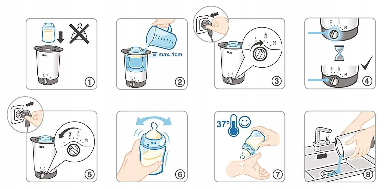 - Die Verwendung des Wärmers ist ganz einfach – egal ob die Nahrung Zimmertemperatur hat oder gefroren ist: Zuerst wird die Flasche oder das ungeöffnete Gläschen mit dem Korb in den Wärmer gestellt, in den anschließend Wasser eingefüllt wird.