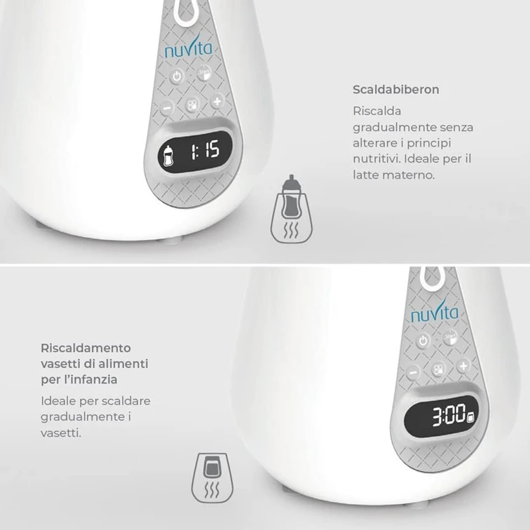 - ? DIGITALE TECHNOLOGIE: Dieser brandneue Nuvita Flaschenwärmer nutzt die neueste innovative Technologie. Sein LCD-Display und die Tasten machen die Auswahl und Kalibrierung der verschiedenen Programme einfach. Die Symbole sind sehr praktisch und zeigen klar die Art des gewählten Programms und seine Funktion an. Kompatibel mit allen Flaschen bis 8 cm Durchmesser!