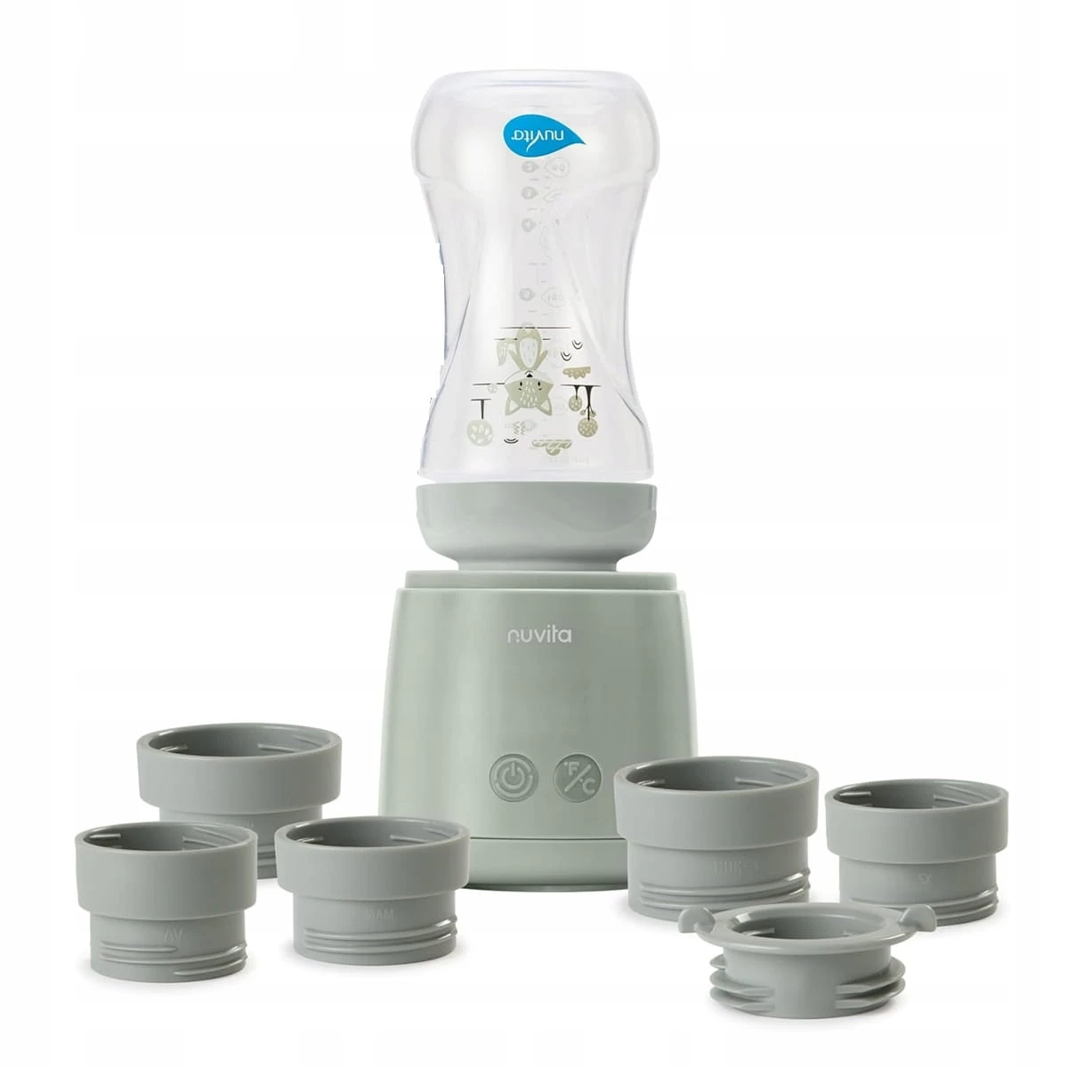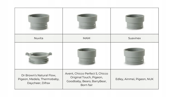 - Das Set enthält 6 Adapter, sodass auch Flaschen anderer Marken als Nuvita mit dem Gerät kompatibel sind (auf einem der Fotos sichtbar).