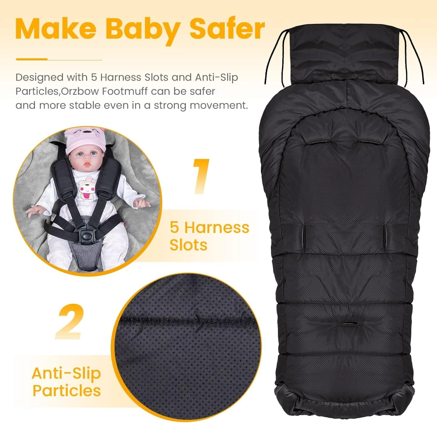 - Zuverlässige Sicherheit und rutschfeste Konstruktion: Ausgestattet mit reflektierenden Streifen und 6 Gurtöffnungen passt der Orzbow Baby Fußsack auf die meisten Kinderwagen und bietet Ihnen und Ihrem Kind ausreichend Sicherheit im Dunkeln. Darüber hinaus verfügt die universelle Orzbow Kinderwagen-Fußstütze über ein starkes Anti-Kipp- und Rutschsystem, das Ihnen hilft, sich um Ihr Kind zu kümmern: ①Rutschfeste Partikel auf der Rückseite ②Abgedecktes Oberteil im oberen Bereich ③Gurte am oberen Panel zur Befestigung am Kinderwagengriff