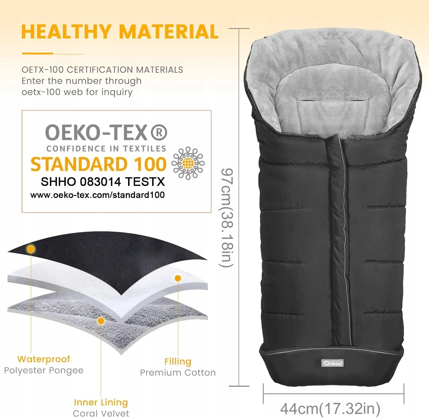 - Premium-Qualität und große Größe: Hergestellt aus hochwertigem, wasserdichtem und schneefestem Pongee-Stoff mit gemütlichem Baumwollfutter und Fleece-Innenfutter (OEKO-TEX 100 Zertifizierung), das hilft, Schmutz leicht zu reinigen und außergewöhnliche Wärme zu bewahren. Der Orzbow warme Kinderwagen-Fußsack mit den Maßen 97 x 45 cm ermöglicht es Ihrem Kind, bequem zu schlafen und sich frei im Kinderwagen zu bewegen oder die Außenwelt auch an kalten Wintertagen zu genießen.