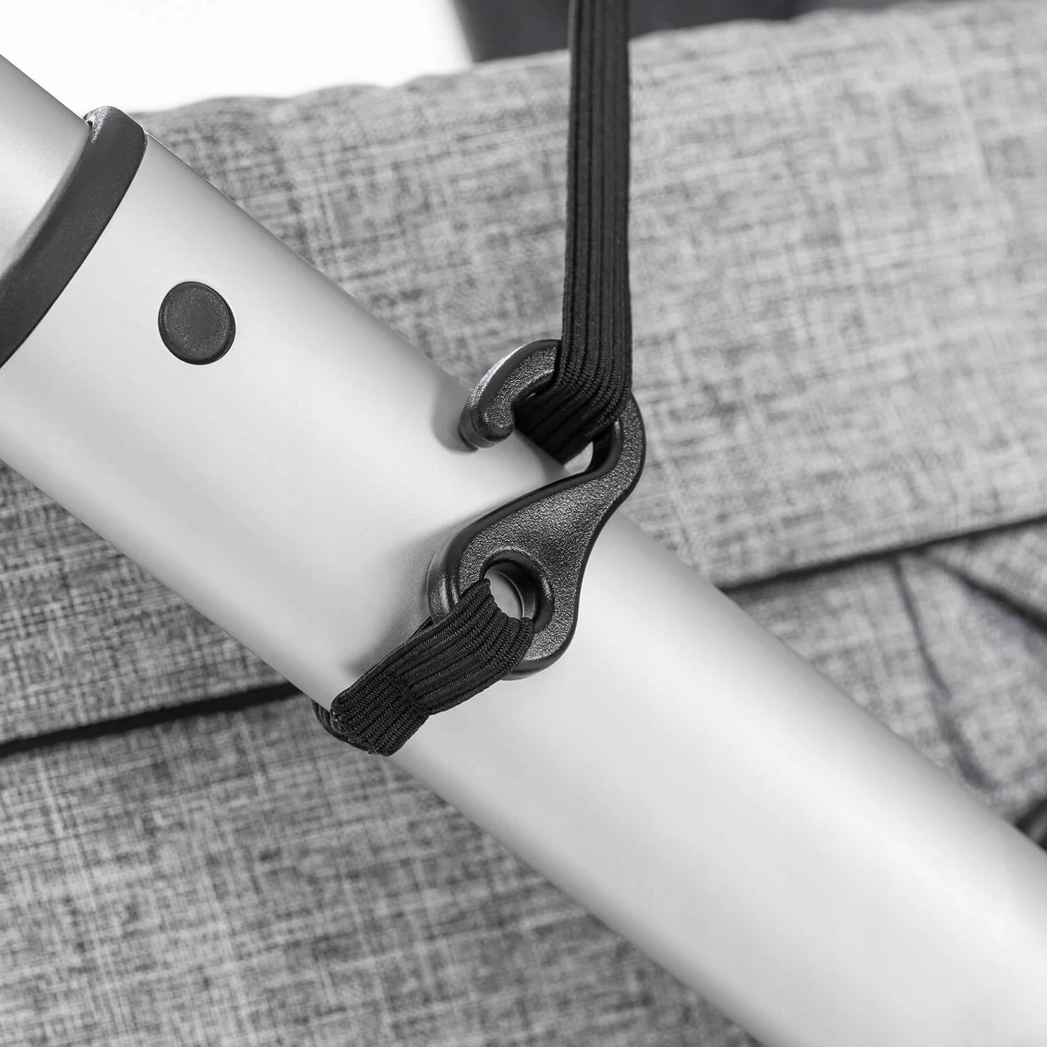 - Einfache Montage – das elastische Band wird um den Kinderwagen gelegt, die 2 Bänder an den Enden des Verdecks werden am Griff des Kinderwagens befestigt.