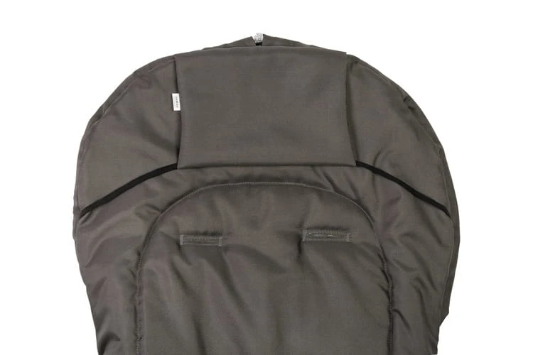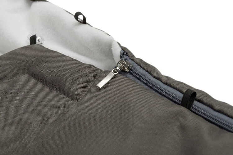 Der Fußsack ist außen mit einem wasserdichten, zertifizierten Material bezogen. Innen ist er mit warmem und angenehm weichem Fleece ausgestattet. Zusätzlich befindet sich dazwischen eine Schicht aus Isolierung.