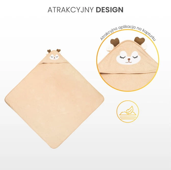 Die Kapuze schützt den Kopf des Kindes vor Kälte und erleichtert das schnelle Trocknen der Haare. Die Applikation in Form niedlicher Tiere zieht die Aufmerksamkeit des Kindes auf sich und macht das Baden zu einem angenehmen Moment des Tages.