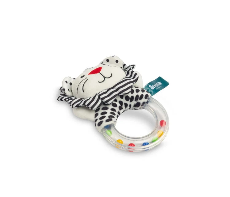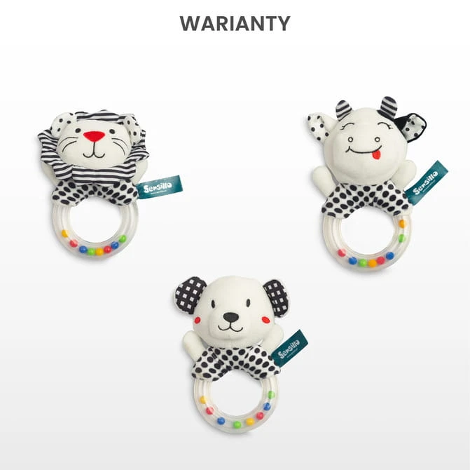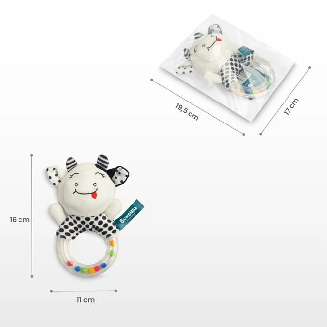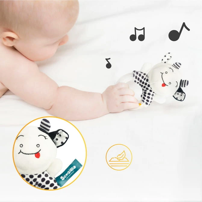 Die Rassel für Babys in kontrastierenden Schwarz-Weiß-Tönen wurde entwickelt, um das Sehvermögen und die sensorische Entwicklung des Kindes zu stimulieren. Ausgestattet mit einem ergonomischen Griff, passt sie perfekt in kleine Kinderhände und ermöglicht ein einfaches Halten. Im Inneren befinden sich feine Perlen, die bei jeder Bewegung einen sanften Klang erzeugen und so die Hörentwicklung und Koordination fördern.