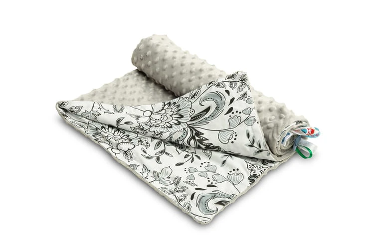 Leichte Minky-Decke ist die perfekte Lösung für Frühlings- und Sommerspaziergänge. Hergestellt aus zarter Baumwolle und weichem Minky-Stoff, kann sie je nach Bedarf beidseitig verwendet werden. Jedes Deckenmuster hat einen anderen farbigen Aufdruck. Auf der Decke befinden sich auch bunte Bändchen, die jedes Baby interessieren werden. Universelle, leichte Decke für Kinderwagen oder Bettchen in der Größe 75×100 cm.