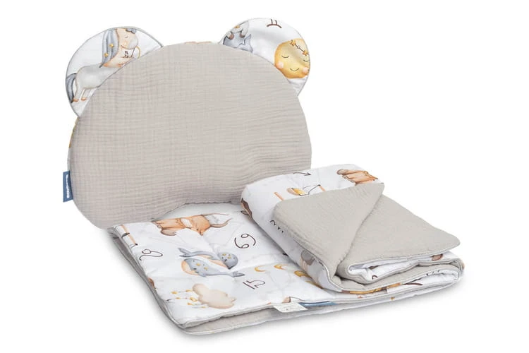 Das Set besteht aus einem Kissen und einer Decke aus angenehm weichem Musselin und Baumwolle. Das Set eignet sich perfekt für den Kinderwagen, das Babybett oder als weiche Spielmatte für Ihr Baby. Das Kissen kann auch als Kuscheltier verwendet werden. Das Set wurde aus zwei Materialien gefertigt – die Innenseite besteht aus 100% Baumwolle, die Außenseite aus weichem Musselin.