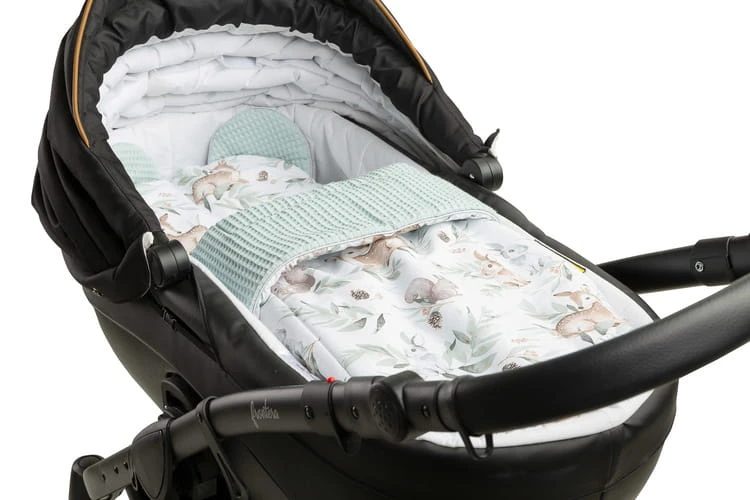 Waffel-Kinderwagen-Set besteht aus einem Kissen (36x28 cm) und einer Decke (56x76 cm). Dank dieser Größen ist das Set ideal für den Kinderwagen, das Babybett oder als weiche Spielmatte für Ihr Baby geeignet. Im Inneren befindet sich eine antiallergische Füllung, die für eine optimale Isolierung gegen Kälte sorgt. Das Kissen kann auch als Kuscheltier verwendet werden. Das Set ist aus 100% Baumwolle gefertigt – auf der einen Seite mit Print, auf der anderen Seite aus weicher Waffel-Baumwolle, die dem Set ein einzigartiges Aussehen verleiht.