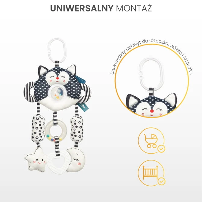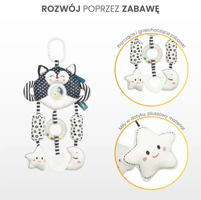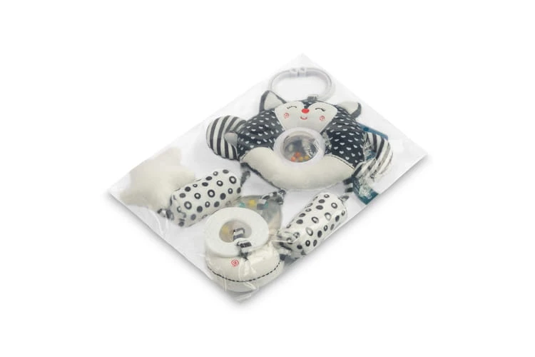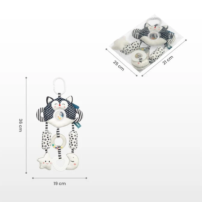 Das Spielzeug besteht aus weichen, angenehmen Materialien in kontrastreichen Farben, die Ihr Baby zum Spielen mit den beigefügten sensorischen Anhängern anregen.