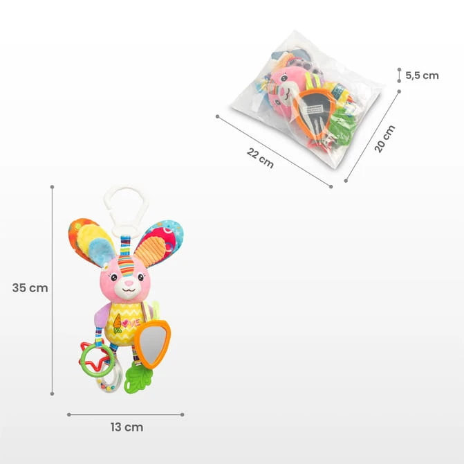 Das Spielzeug verfügt über einen Spiegel, eine Rassel sowie verschiedene Elemente zum Greifen und Beißen. Lebendige Farben und kontrastreiche Muster ziehen die Aufmerksamkeit des Kindes auf sich und fördern die visuelle Entwicklung, während weiche Ohren und Noppen zum Erkunden anregen und den Tastsinn stimulieren.