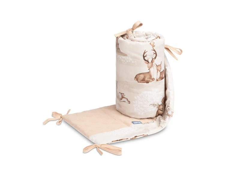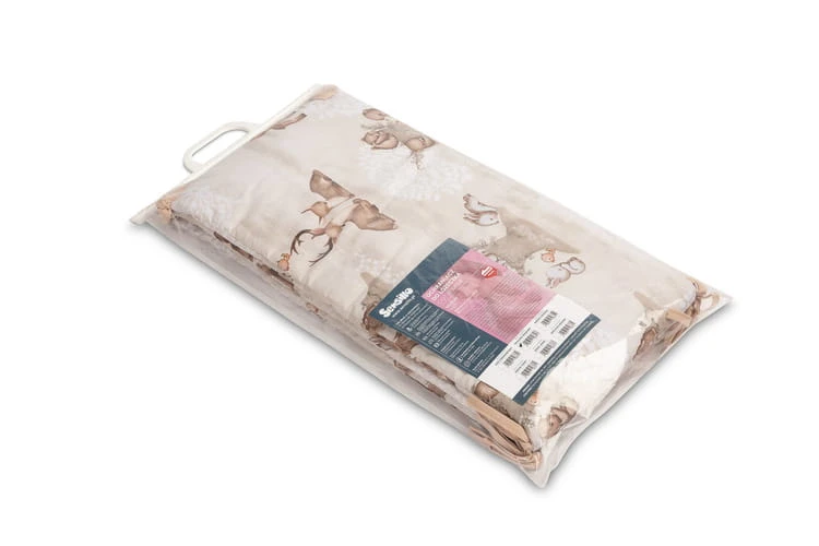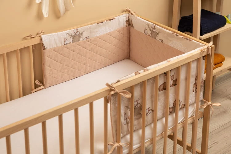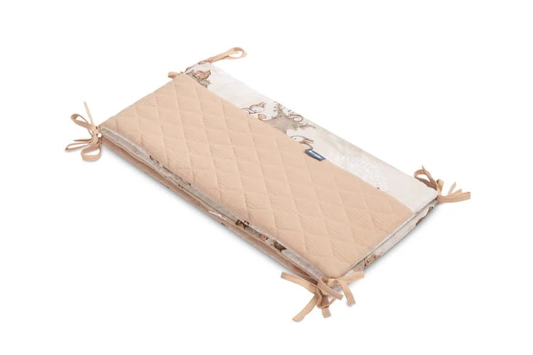 Das Bettgitter passt in jedes Standard-Babybett. Der Bettgitter ist aus weicher Baumwolle mit Aufdruck und angenehm zu berührendem Musselin gefertigt. Die Polyesterfüllung schützt das Kind vor Verletzungen beim Bewegen im Bett. Bänder sorgen dafür, dass der Bettgitter in der richtigen Position bleibt, indem sie ihn an den Gitterstäben des Bettes befestigen. Er ist für ein Bett mit den Maßen 120x60 cm konzipiert. Der Bettgitter ist eine perfekte Ergänzung für die Erstausstattung eines Babys.