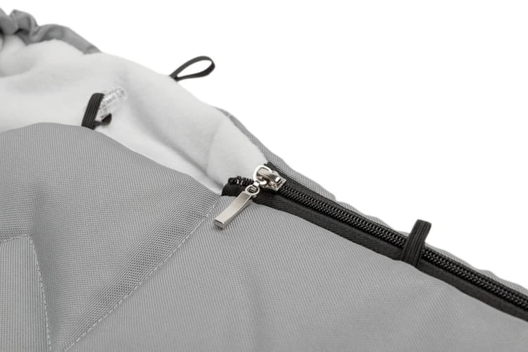 Der Fußsack ist außen mit einem wasserdichten, zertifizierten Material bezogen. Innen ist er mit warmem und angenehm weichem Fleece ausgestattet. Zusätzlich befindet sich dazwischen eine Schicht aus Isolierung.