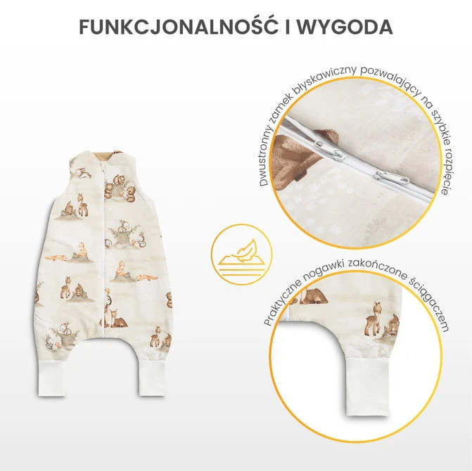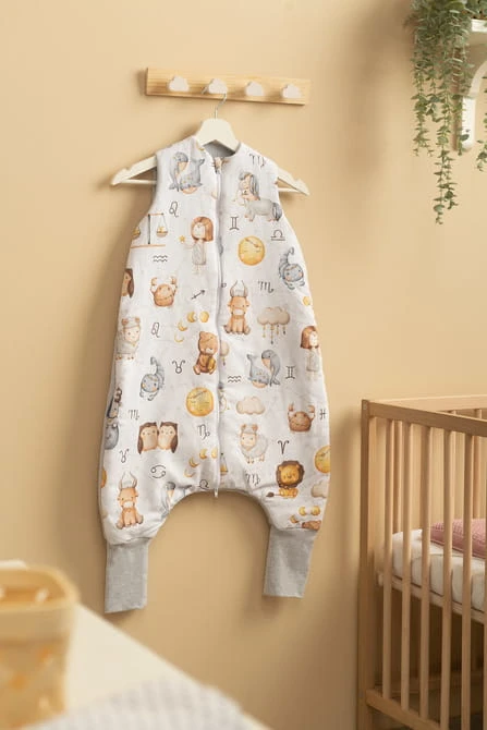 Ganzjahres-Schlafsack mit Beinen sorgt für sicheren und komfortablen Schlaf an warmen Tagen und Nächten. Zwischen zwei Baumwollschichten befindet sich eine weiche Wattierung, die dem Schlafsack einen TOG-Wert von 1,0 verleiht und die Nutzung das ganze Jahr über ermöglicht. Der Schlafsack ist ideal für Räume mit einer Temperatur von 18-24°C.
