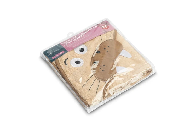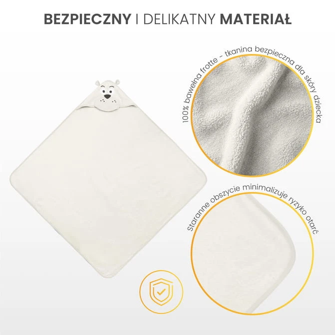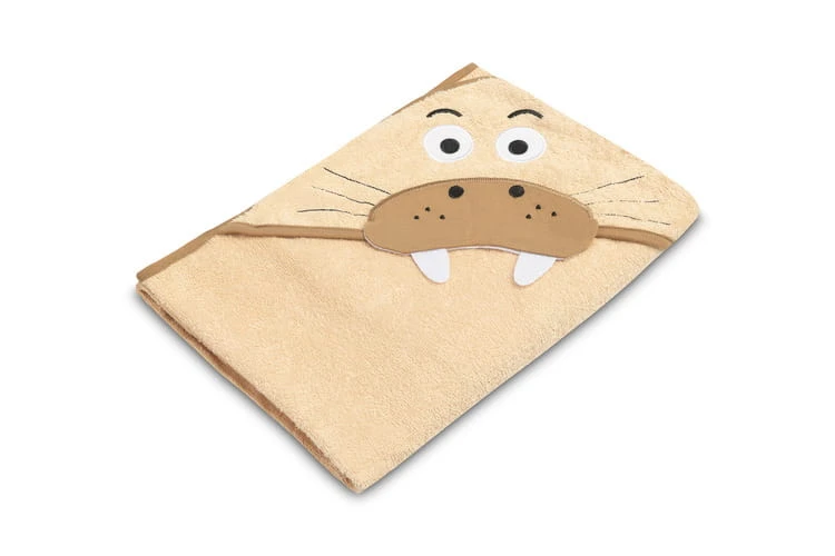 Die Kapuze schützt den Kopf des Kindes vor Kälte und erleichtert das schnelle Trocknen der Haare. Die Applikation in Form niedlicher Tiere zieht die Aufmerksamkeit des Kindes auf sich und macht das Baden zu einem angenehmen Moment des Tages.