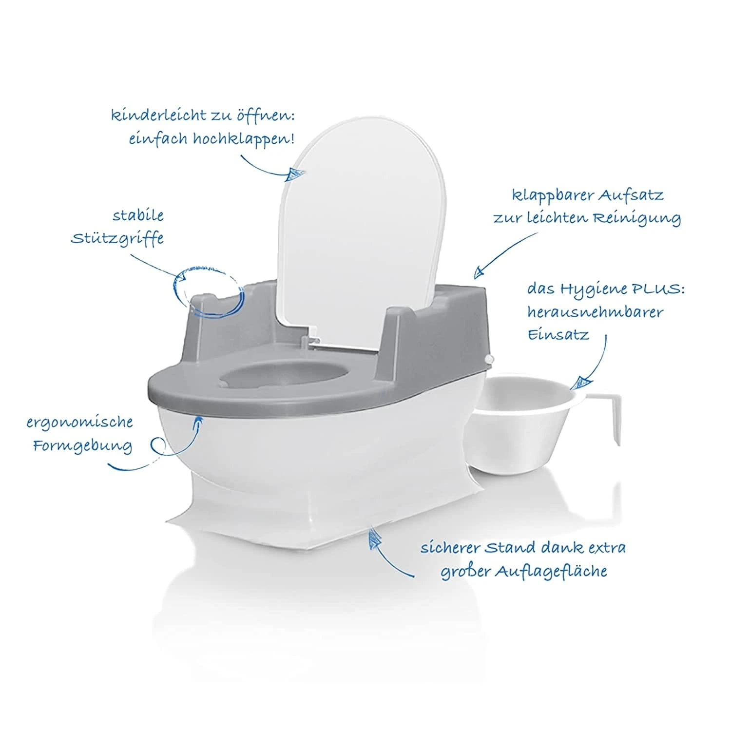 - Leicht zu reinigen: Hygienische Entleerung dank klappbarem Sitz und herausnehmbarer Einlage