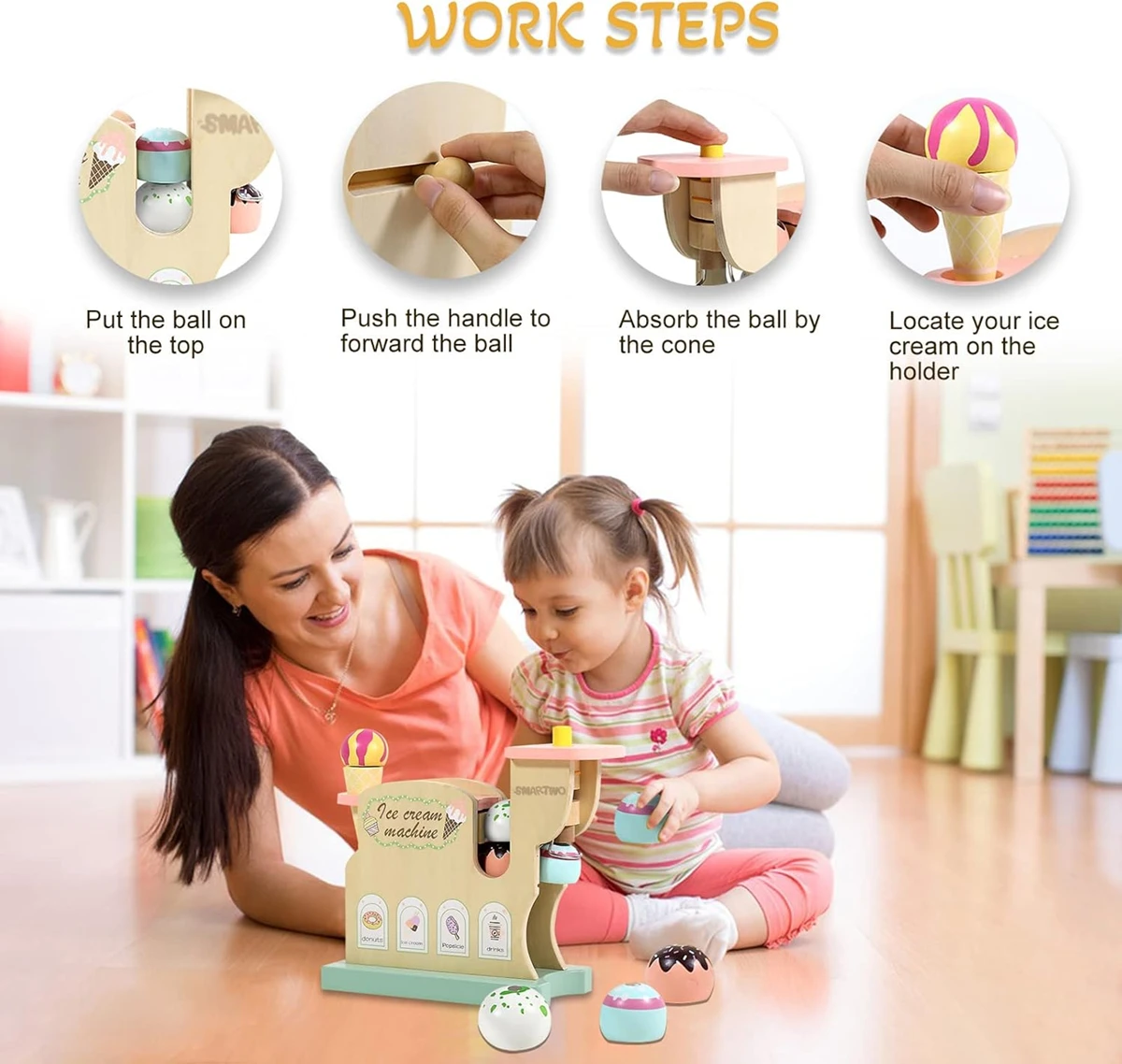 Eis, bitte! Dieses Holzspielzeug zum Eismachen ermöglicht es Kindern, Eiskugeln dank einer einfachen, mechanischen Konstruktion „herzustellen“. Es ist nicht nur ein süßes Rollenspiel, sondern auch ein großartiges Training für Hand-Auge-Koordination, Griff und Geduld.