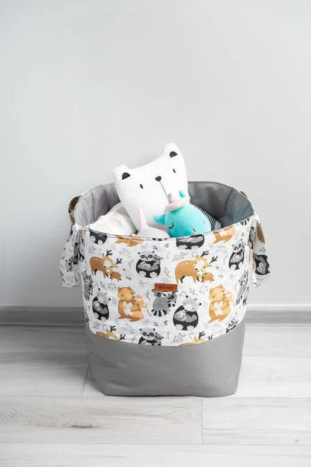 Spielzeugkorb Medium ist sehr geräumig und äußerst langlebig. Dank der quadratischen Basis bietet er mehr Platz als herkömmliche Körbe. Die Tragegriffe sind innen mit Gurtband verstärkt, sodass auch große Mengen an Spielzeug kein Problem darstellen. Der untere Teil des Korbes sowie das Innere bestehen aus strapazierfähigem Polyestergewebe, das wenig anfällig für Abrieb und Risse ist, während der obere Teil mit farbenfroher Baumwolle verziert ist, die dem Korb einen einzigartigen Charme verleiht und ihn zur Dekoration des Kinderzimmers macht. Er eignet sich auch hervorragend als Wäschekorb oder Organizer für andere Gegenstände. Verstärkt mit einer Schicht Silikonvlies, behält er seine Form und kann bei Bedarf zusammengefaltet und in einer Schublade verstaut werden. Hergestellt in Polen aus hochwertigen Materialien.