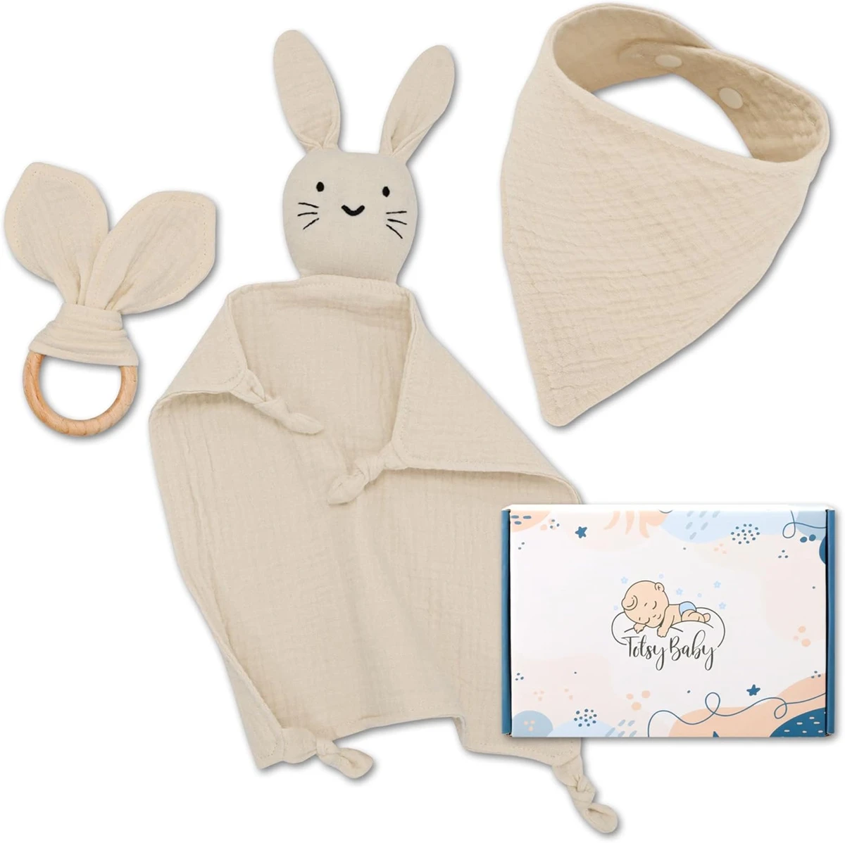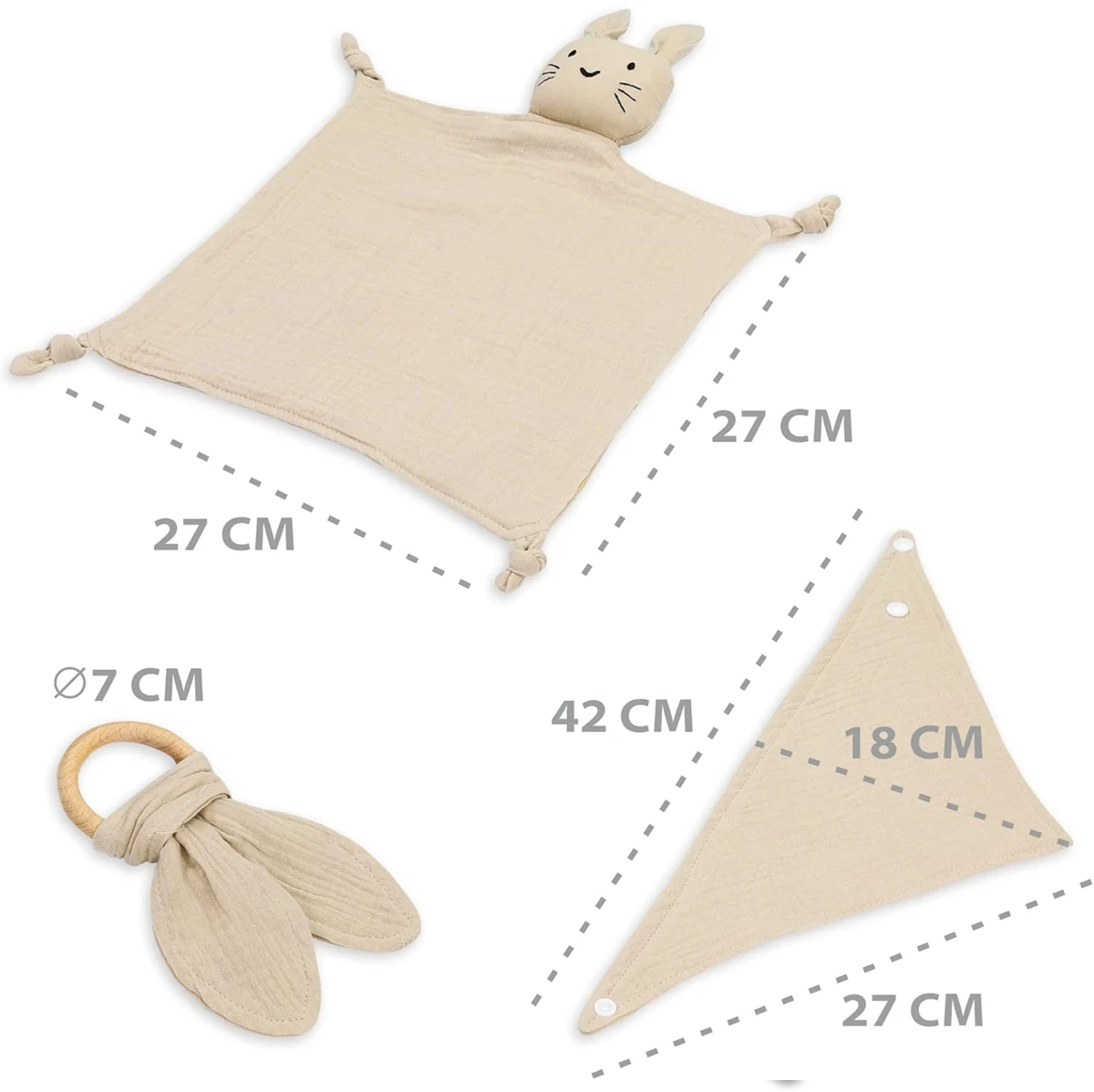 TOTSY BABY Musselin-Komforter und Lätzchen, Holz-Beißring 27x27 cm HASE
