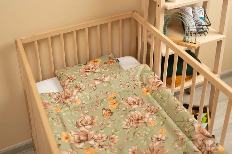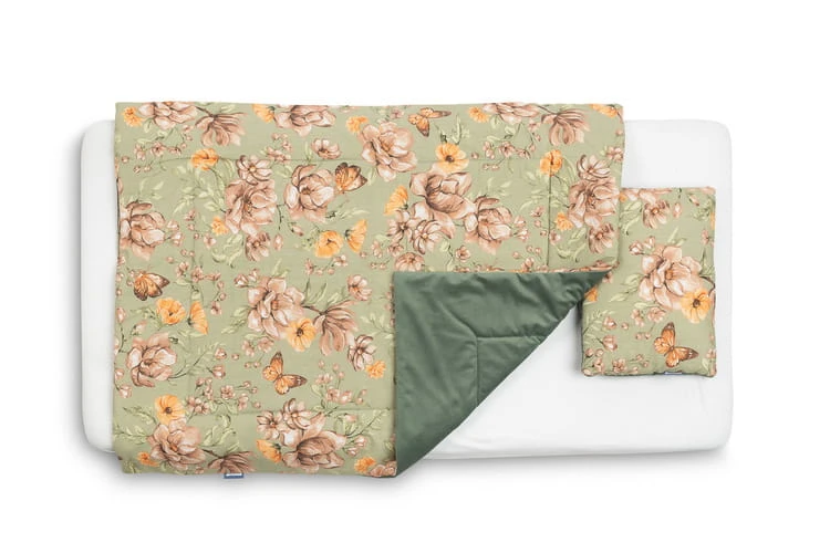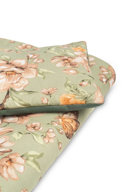 Das Bettwäscheset besteht auf der einen Seite aus hochwertiger, farbenfroher Baumwolle und auf der anderen Seite aus angenehm weichem Velvet. Es besteht aus einem flachen Kissen und einer Decke mit antiallergischer Füllung. Der kuschelige Stoff umhüllt jedes Baby sanft.